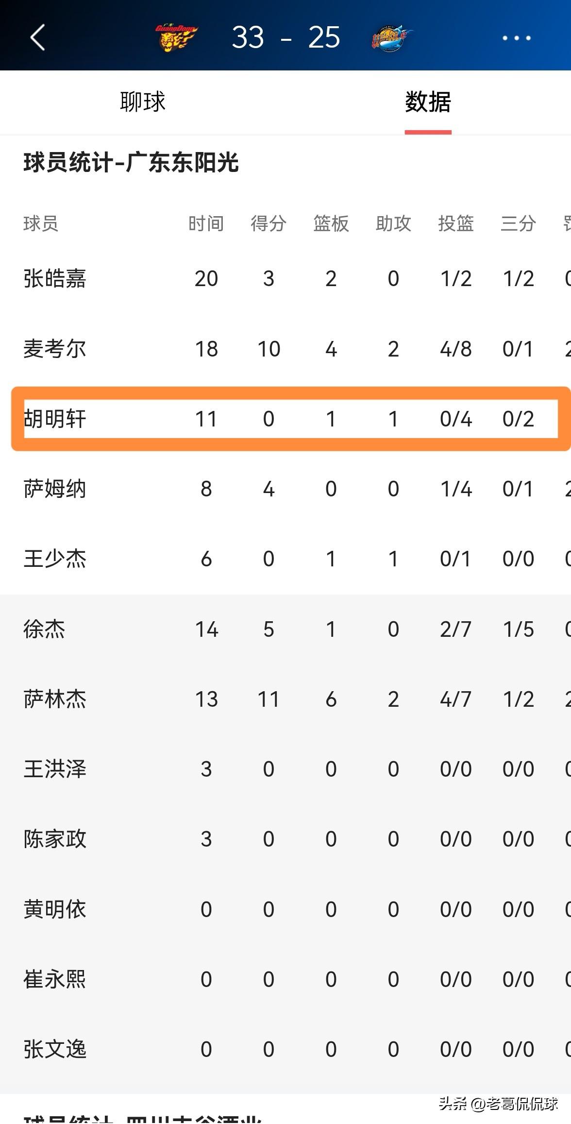 广东东阳光球星胡明轩真是一个大笑话!在今天广东东阳光主场迎战四川丰谷酒业的比赛中,目前双方的上半场比赛已经结束,虽然广东东阳光以33:25处于领先,但是胡明轩的表现一如既往的拉胯。 在前两节比赛中,胡明轩首发出战11分钟,投篮4中0怒砍0分,仅仅得到1篮板1助攻。 毫不客气的说,作为广东东阳光的核心球员和领袖,胡明轩在上半场比赛中的表现简直就是一个大笑话。
