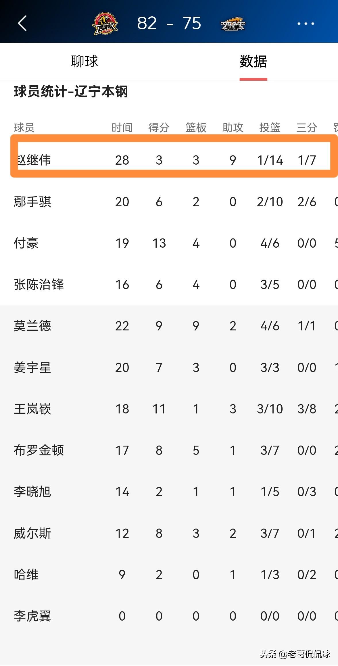 辽宁本钢后卫赵继伟的表现真是一场灾难!在今天辽宁本钢客场以75:82输给长白山恩都里的比赛中,赵继伟在投篮端的表现完全就是一场灾难。 全场比赛下来,赵继伟首发出战28分钟,投篮14中1,其中三分球7中1无比低效的得到可怜的3分,还有3次犯规,他的场上正负值为-11。 毫不客气的说,今晚赵继伟在做梦的时候也会梦到自己在场上疯狂打铁的声音。