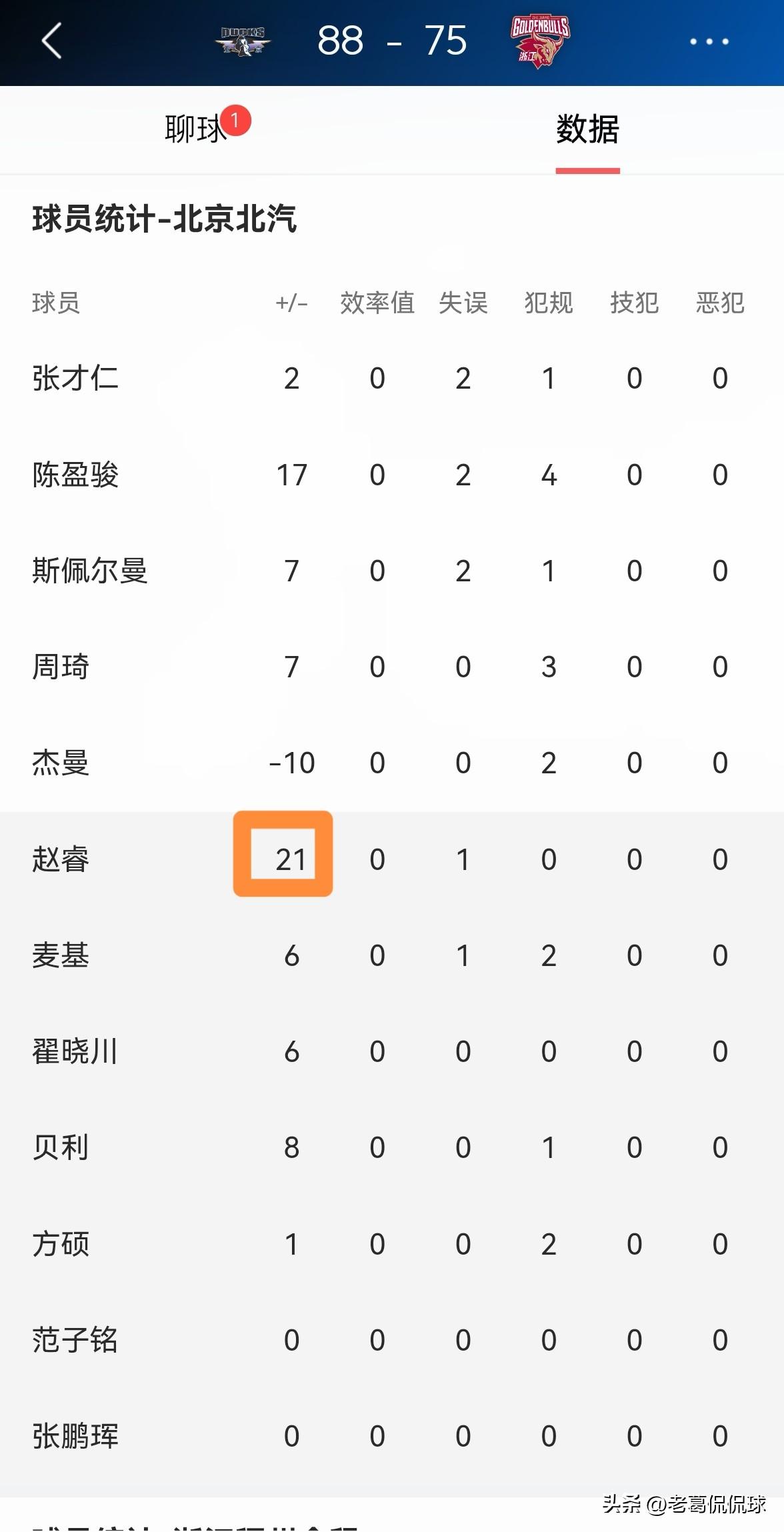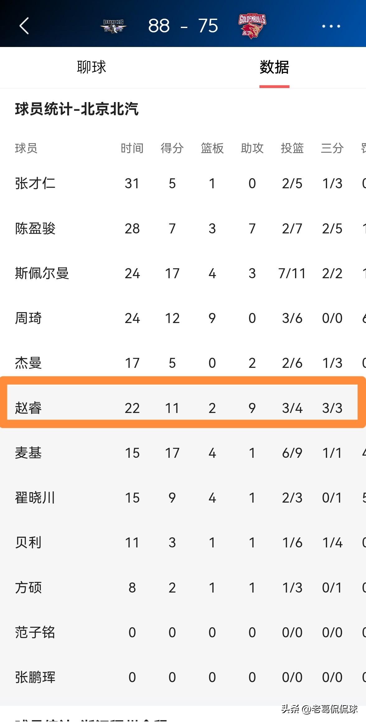 北京北汽当家后卫赵睿真是既能得分又能传球!在今天北京北汽主场以88:75击败浙江稠州金租的比赛中,赵睿不仅在进攻端表现高效,而且送出了全队最多的9次助攻,真的是得分助攻一肩挑。 全场比赛下来,赵睿替补出战22分钟,投篮4中3,其中三分球3中3、罚球2中2非常高效的砍下11分,还有2篮板9助攻,他的场上正负值为全队最高的+21。 老实说,随着赵睿的状态变得越来越好,他对于北京北汽的重要性正在慢慢的显现出来了。