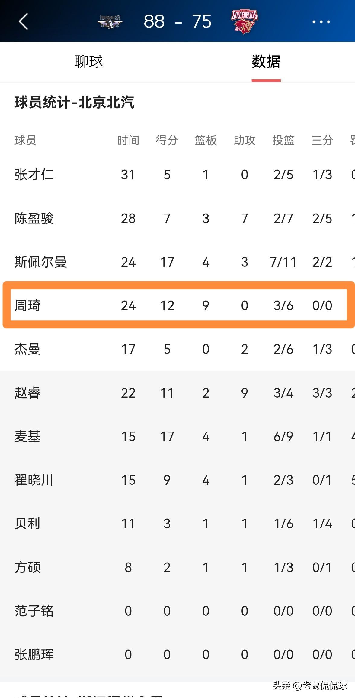 北京北汽巨星周琦的罚球真是大有起色!在今天北京北汽主场以88:75战胜浙江稠州金租的比赛中,周琦在罚球线上的表现和上一场比赛相比有了非常大的起色。 整场比赛下来,周琦首发出战24分钟,投篮6中3,其中罚球7中6轻松砍下12分,还有9篮板2盖帽,他的场上正负值为+7。 实事求是的说,如果周琦能够在接下来的比赛中延续如此高的罚球命中率,那么周琦在篮下的威力将会变得更大。