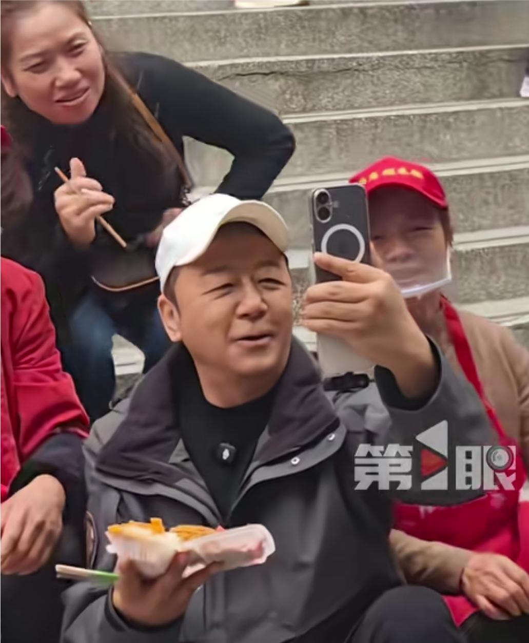 演员郭涛在重庆朝天门大生商场门口,坐在梯坎上吃着糯米盒饭,边吃边合周边上摆起了龙门阵,慢慢的,认出他人越来越多,走上前和他们合了影,网友直呼,好接地气,一点也没得明星架子。