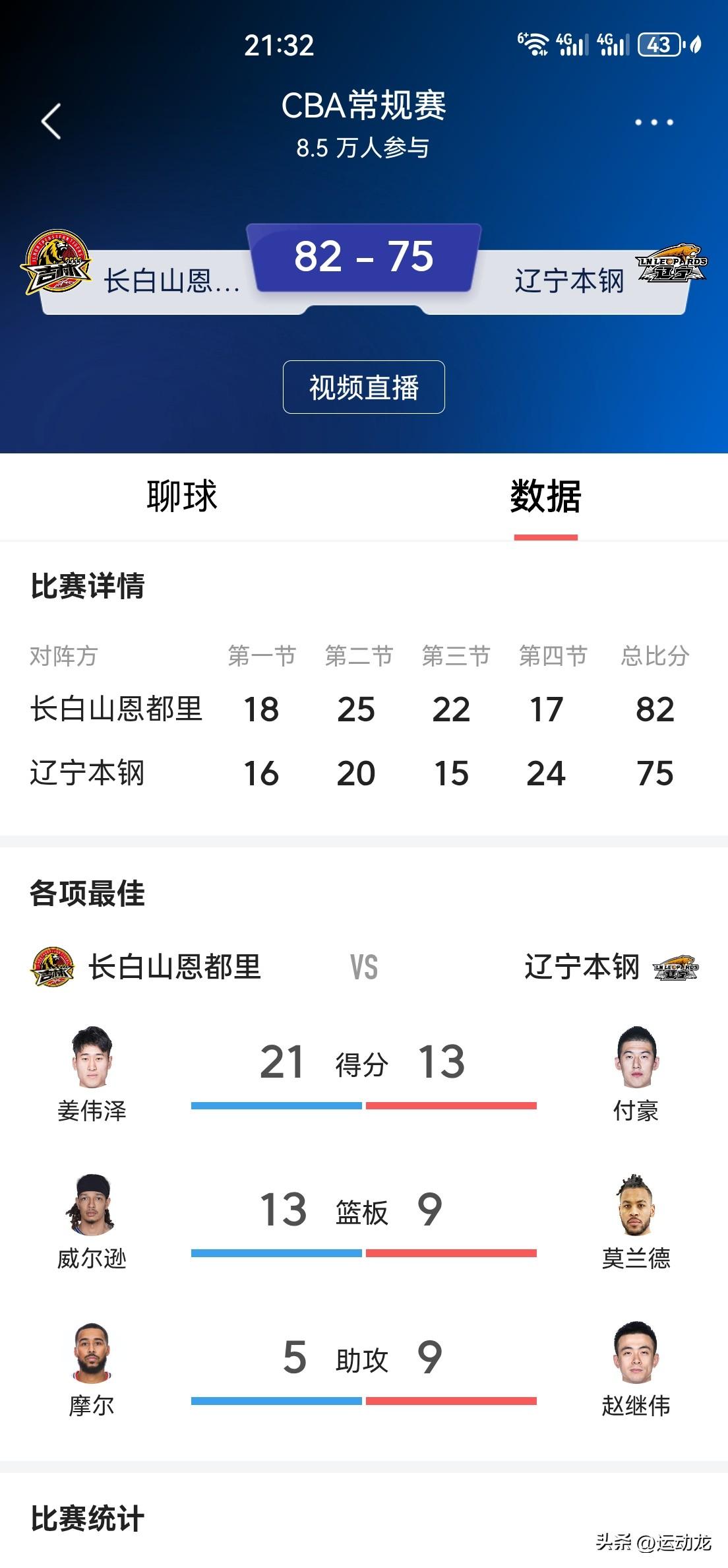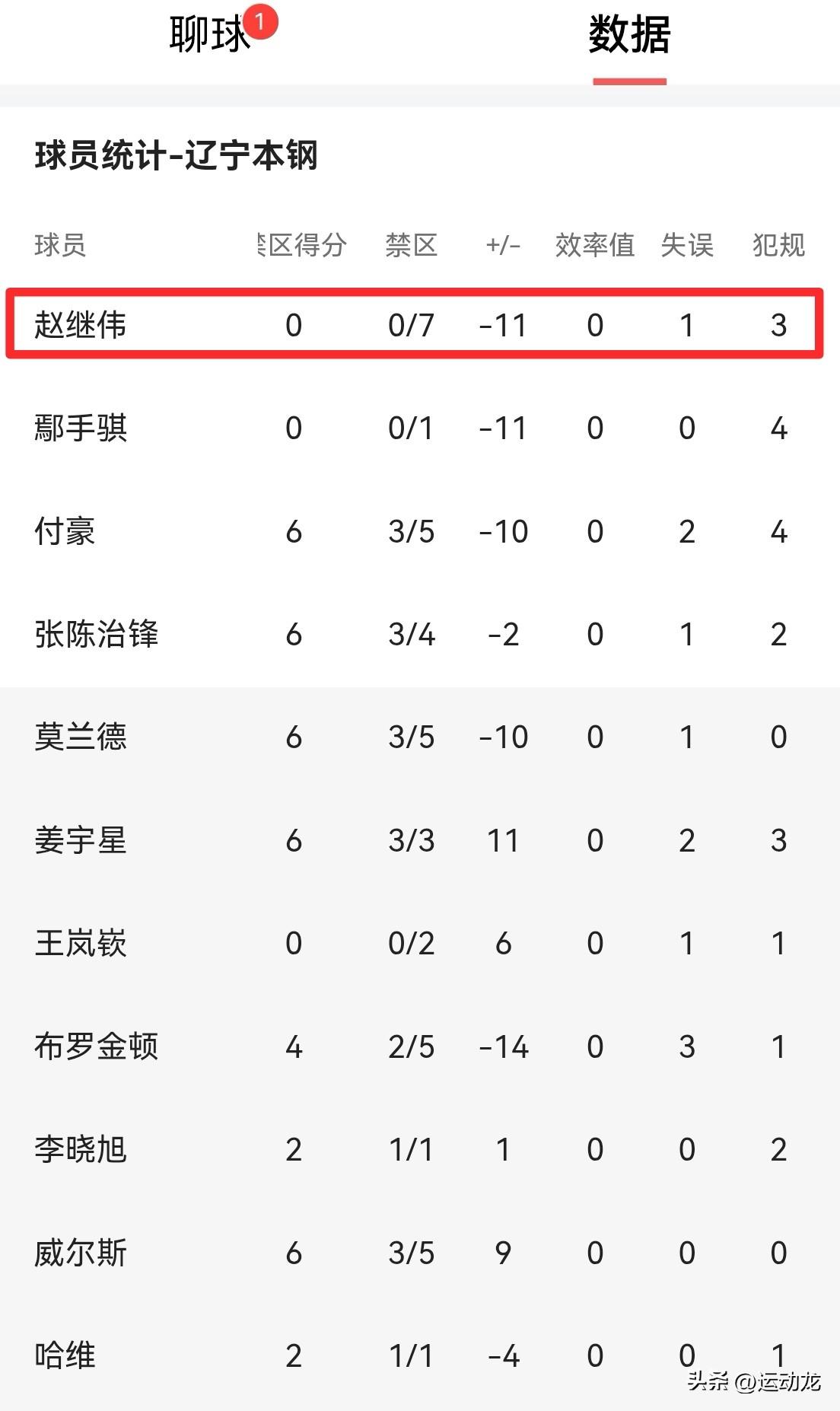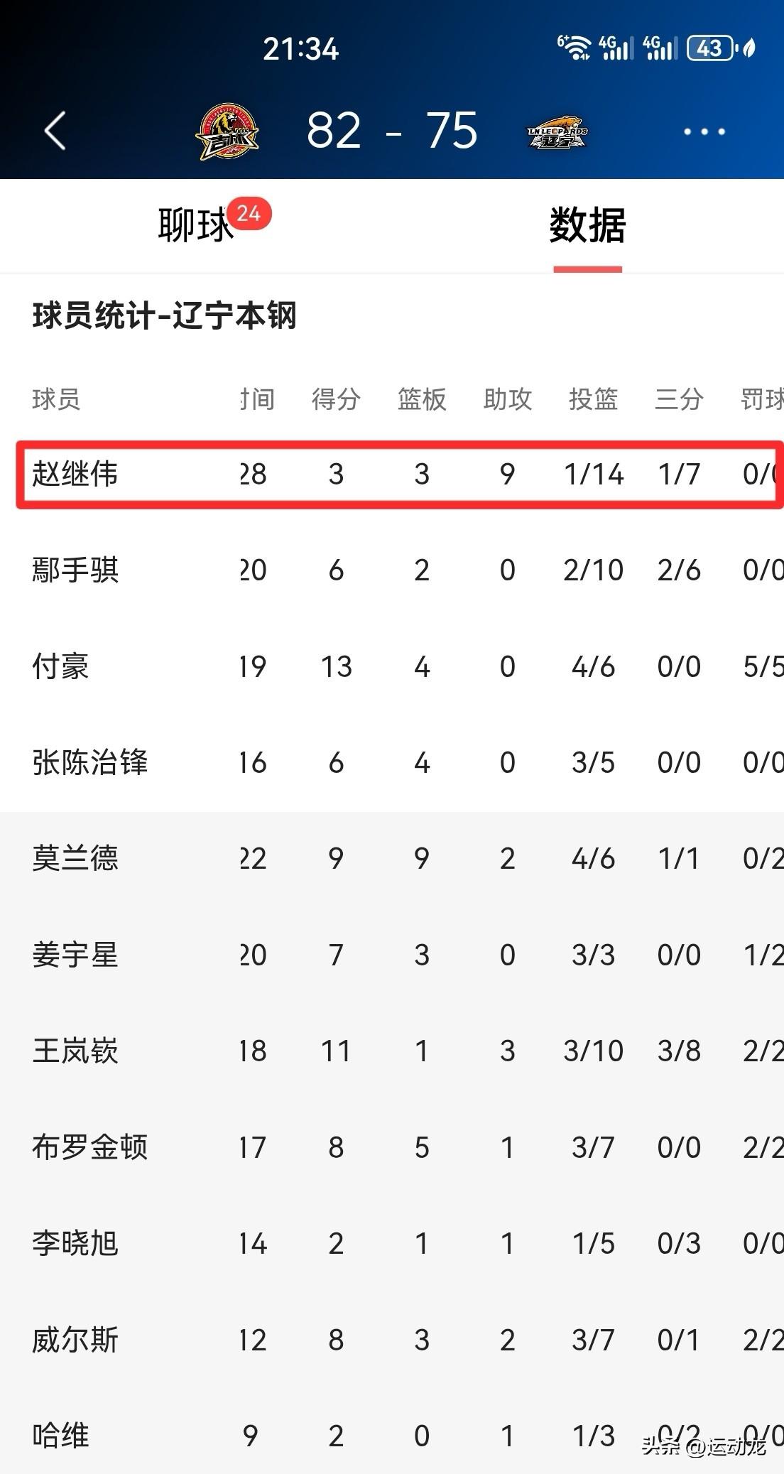 赵继伟手感掉到冰点!辽宁75:82惨败东北小兄弟吉林。 本场比赛,辽宁队长赵继伟出场全队最长的28分钟,14投1中,其中三分球7投1,得到3分3篮板9助攻,正负值-11。 辽宁队本场前三节比赛一直被吉林压着打,前三节比分分别是:18:16、25:20、22:15,第三节中段辽宁队一度落后18分,并带差落后14分的分差进入第四节比赛。虽然第四节辽宁队奋起直追,打出24:17的攻击波,奈何前三节挖坑太深,未能像上一场对阵南京队一样实现18分超级大逆转。