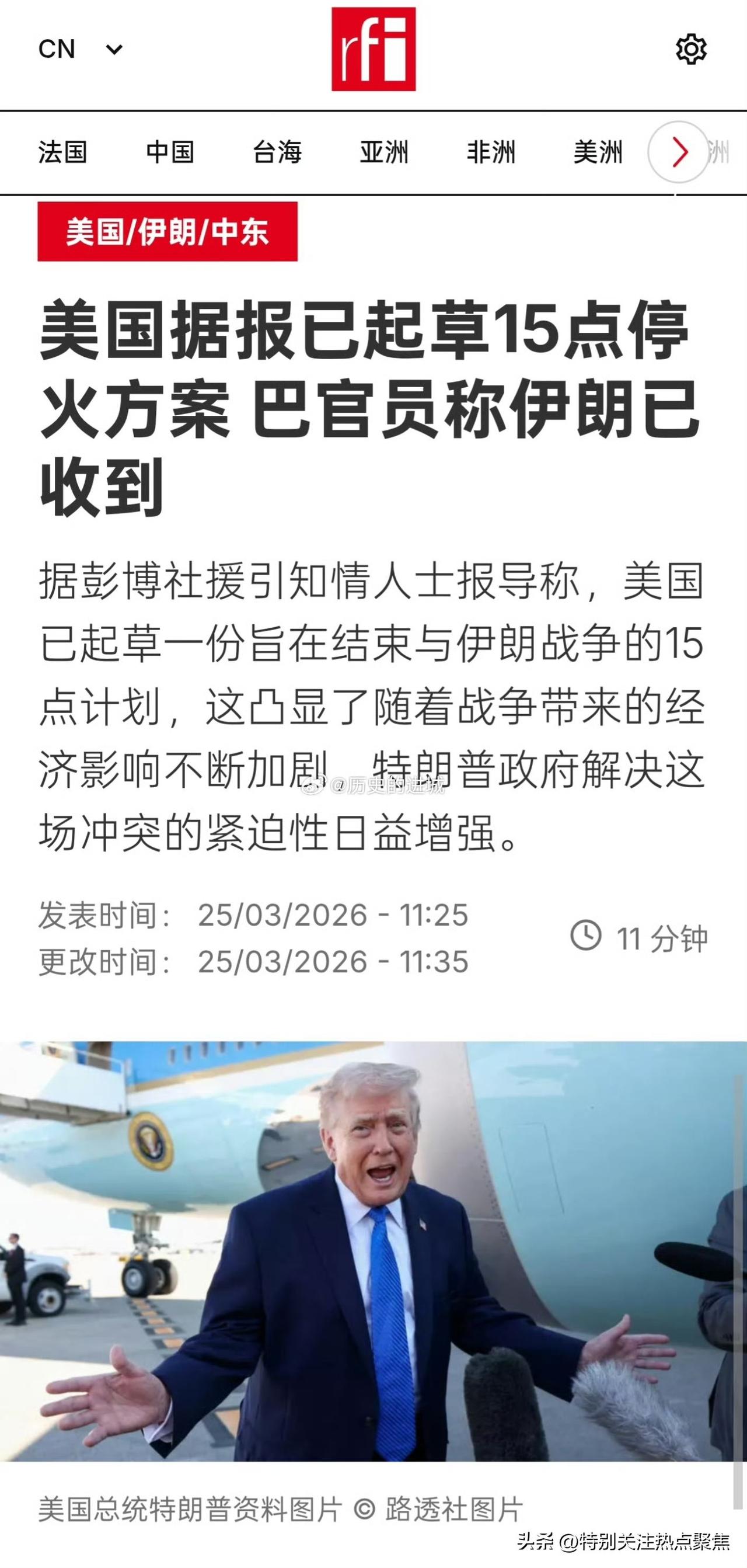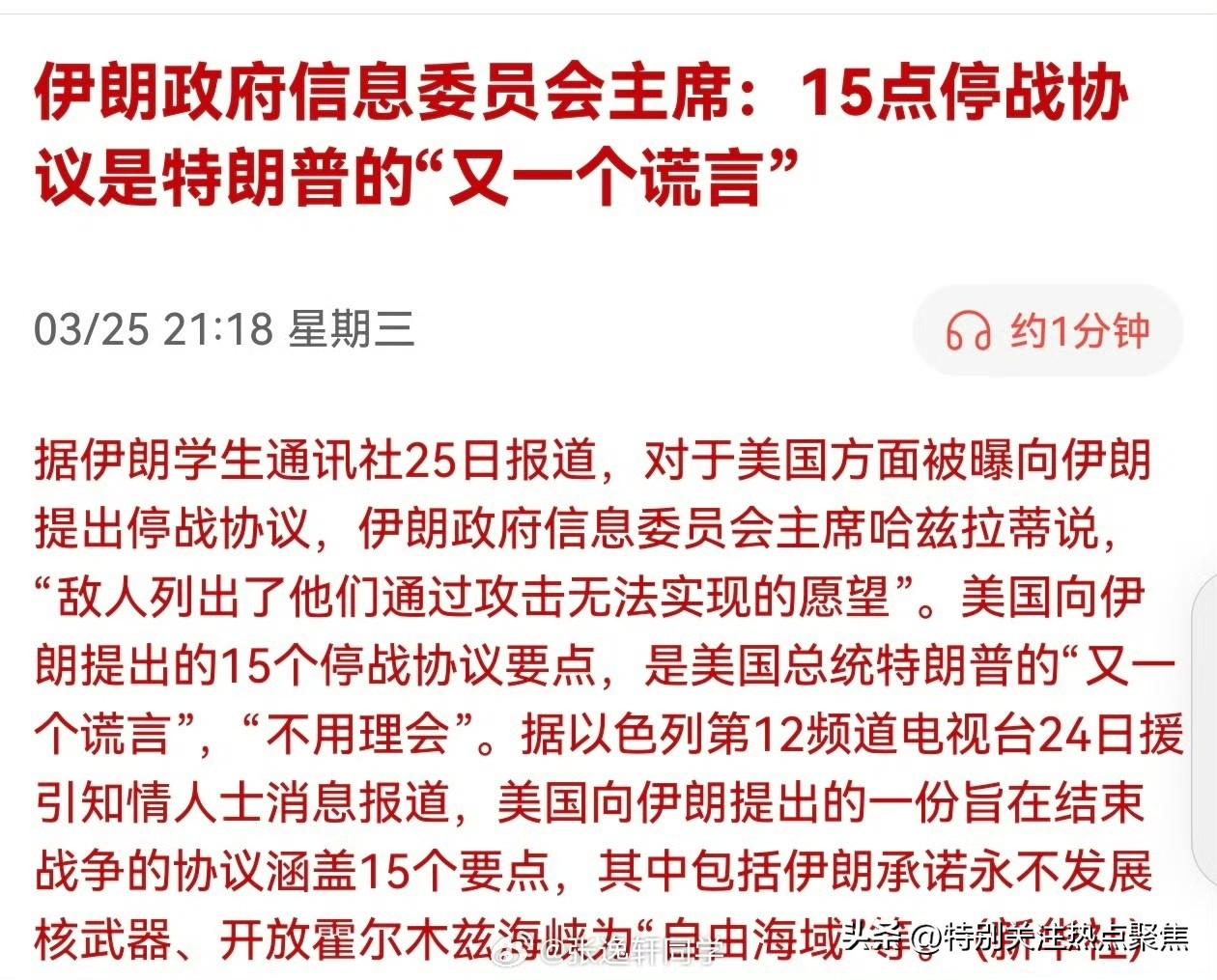 伊朗真实承诺4打到第80轮 伊方官方回应:美国提出的所谓15 点停战协议”是总统特朗普的“又一个谎言”,强调“不用理会”, 据伊朗学生通讯社25日报道,对于美国方面被曝向伊朗提出停战协议,伊朗政府信息委员会主席哈兹拉蒂说,“敌人列出了他们通过攻击无法实现的愿望”。美国向伊朗提出的15个停战协议要点,是美国总统特朗普的“又一个谎言”,“不用理会”。 伊朗方面坚决否认与美国达成停战协议,斥责相关报道为谎言和心理战。 伊方官方回应:伊朗政府信息委员会主席哈兹拉蒂明确表示,美国提出的所谓15 点停战协议”是总统特朗普的“又一个谎言”,强调“不用理会”,并指出这是敌人列出了他们通过攻击无法实现的愿望。伊朗武装部队发言人同日喊话美国,“别把你们的失败称为协议”。 否认谈判事实:伊朗外交部及高级安全官员多次澄清,目前与美国“不存在对话”,也没有进行任何谈判,特朗普的相关表态被视为旨在操纵能源价格、为军事部署争取时间的“心理战”和“欺骗策略”。伊朗伊斯兰议会议长卡利巴夫也发文否认谈判,称散布虚假新闻是为了操纵金融和石油市场,帮助美以摆脱困境。 协议内容传闻:此前有以色列媒体援引知情人士消息报道称,美方提出了一份包含 15 个要点的协议,主要要求伊朗承诺永不发展核武器、拆除核设施、停止铀浓缩、放弃地区代理人模式、限制导弹计划以及开放霍尔木兹海峡等;作为交换,美方将解除制裁并协助伊朗发展民用核电。 美方表态矛盾:美国总统特朗普声称伊朗已同意永远放弃核武器并在霍尔木兹海峡问题上让步,宣称“美国已经赢了”;然而伊朗方面一贯立场是不寻求拥有核武器,且对美方的单方面宣称予以强烈驳斥。