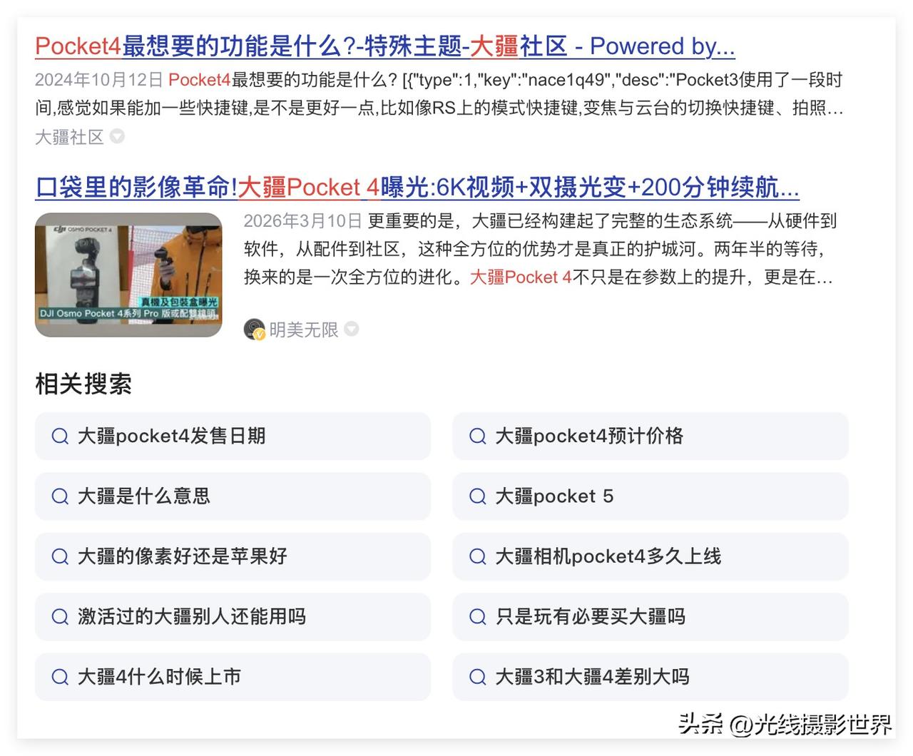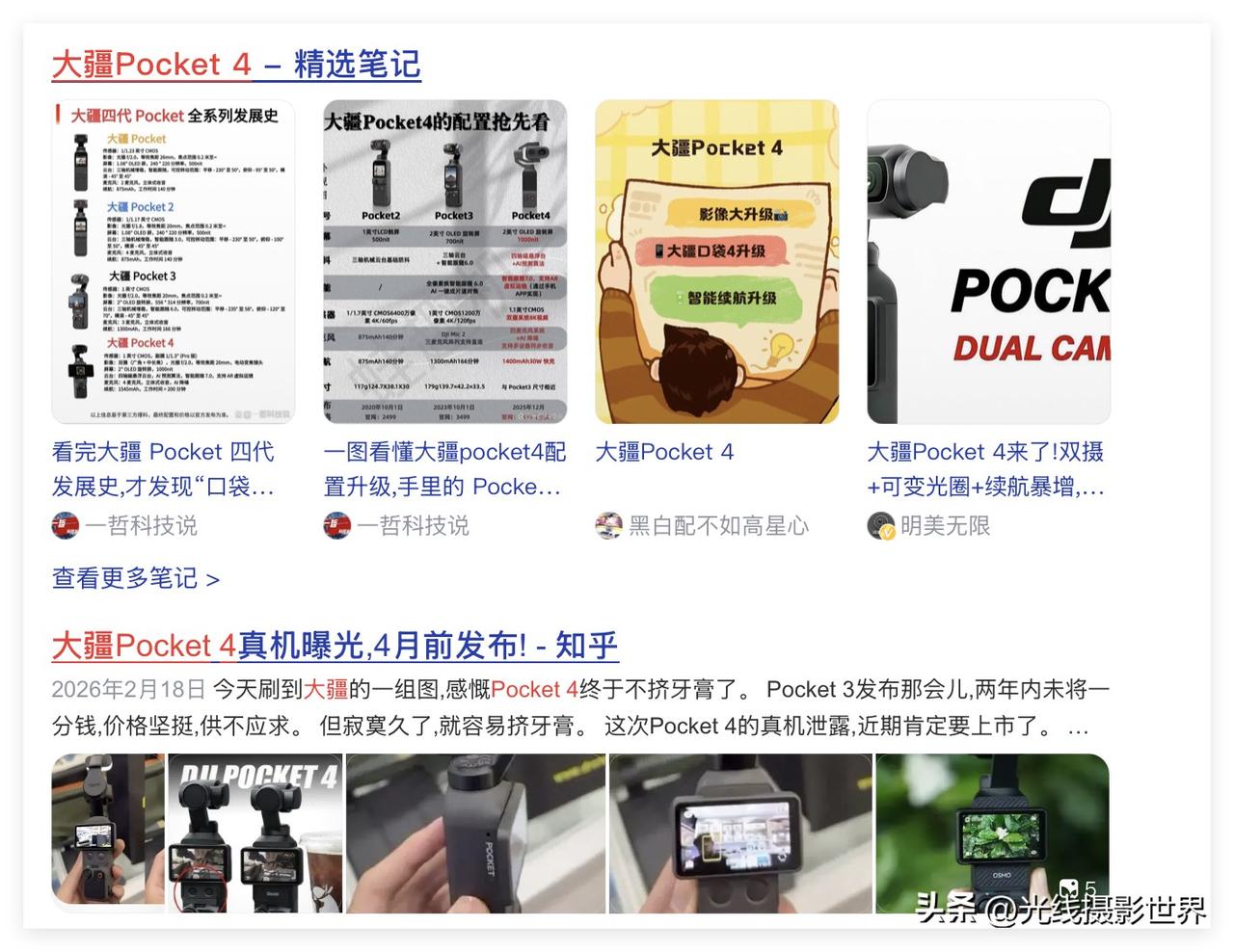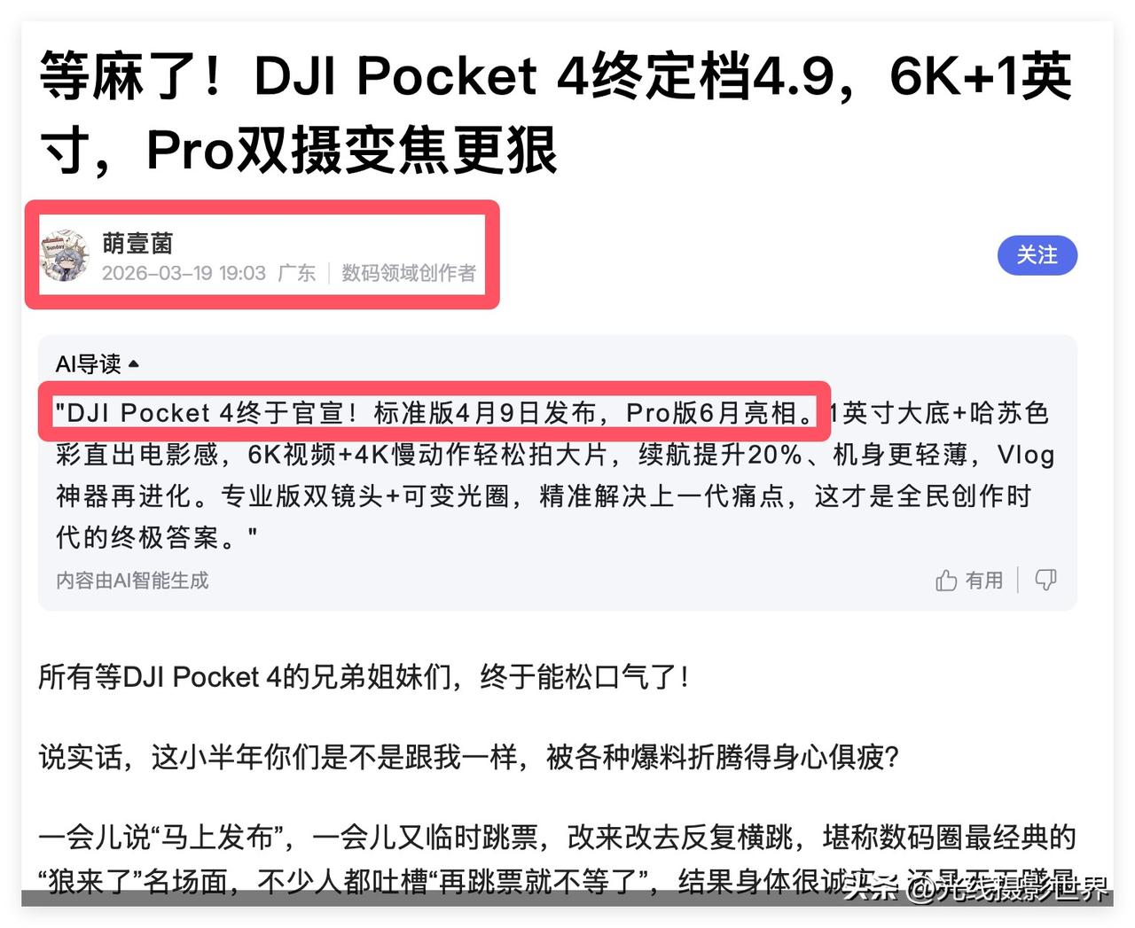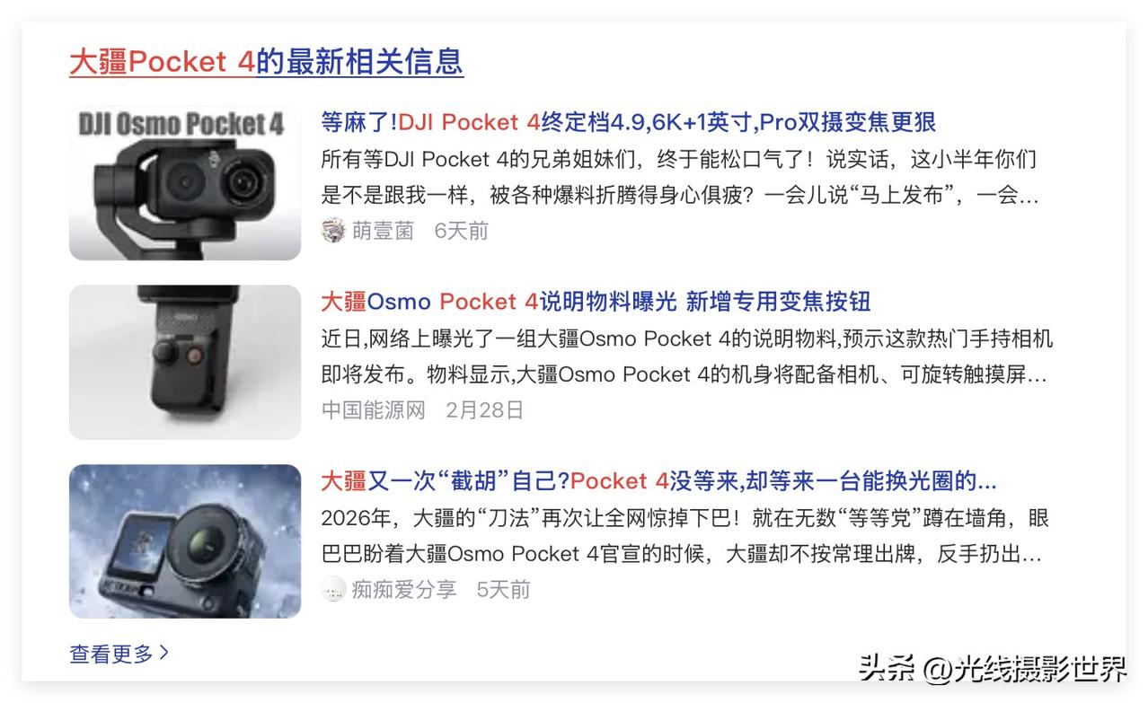 哎呀!真的是让人望眼欲穿啊!3月26日,大疆发布会,究竟会不会发布全新的Pocket 4甚至Pocket 4 Pro呢?!好像一些AI的回答也是抽风一样,可能被不可靠的信源给污染了吧?! 不得不说,2026年,大多数现场采访的记者媒体,好像都放弃了专业摄像机和索尼全画幅微单……拍照手机,大疆Pocket 3,大疆Action6……成为了主力军! 可惜,Pocket 3,没有长焦镜头……如果Pocket 4pro真的具备长焦镜头,恐怕各地融媒体中心的记者编辑……可能都会积极抢购,人手一台,自费购买……无需单位配发,哈哈哈! 2026年3月26日的大疆发布会……真的是太令人期待啦! 其实,大疆Pocket 4标准版,大家也没啥特别期待的…… 大家真正有期待的,主要还是Pocket 4 pro的长焦镜头……这个是刚需的刚需啊! 好吧……最近存储卡涨价太厉害了……硬盘涨价也很厉害……所以,其实,大多数人对于所谓的4k,6k,8k或者专业视频格式或者RAW格式视频,也没啥期待……真的是没啥必要啊! 但是,Pocket 4pro真的需要一个长焦镜头啊! 不过,鉴于Pocket 4的主摄像头的焦距不是很长……所以,Pocket 4pro的长焦镜头,也许不需要85mm,也许50-60mm即可……4800万像素的50-60mm的长焦镜头……数码变焦至85-135mm应该也有很强的可用性…… 如果Pocket 4pro补上长焦的短板……估计很多人都会放弃购买iphone18pro…… 对于短视频拍摄来说……对于现场采访来说……对于大多数日常的需要实拍的视频来说……相信,Pocket 4 pro应该是很够用了! 好吧,Pocket 3和4,没有长焦镜头……确实不好使了……如果大家都知道Pocket 4pro可能会有长焦镜头…… 拥有了长焦镜头的Pocket 4 pro……太棒啦! 光线摄影世界曾兰谈天说地