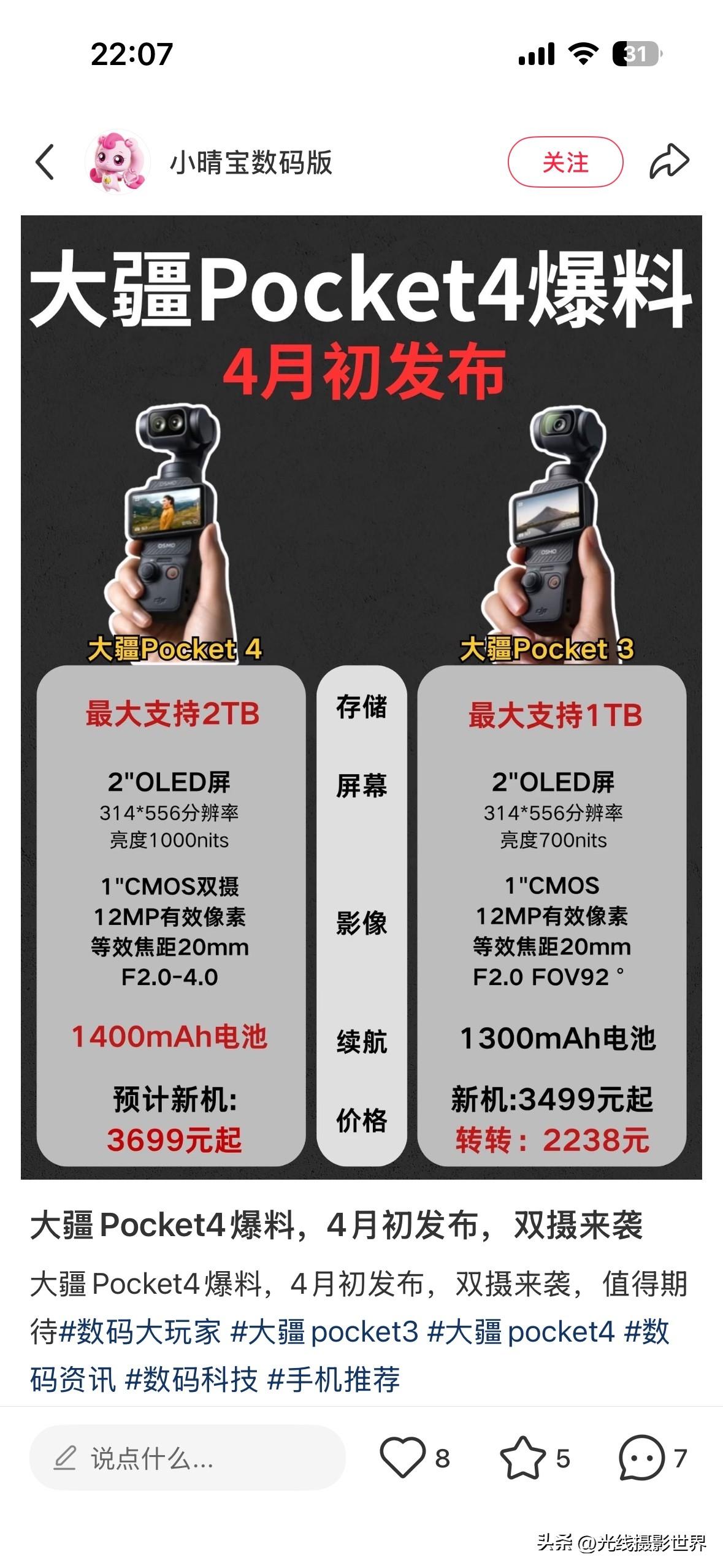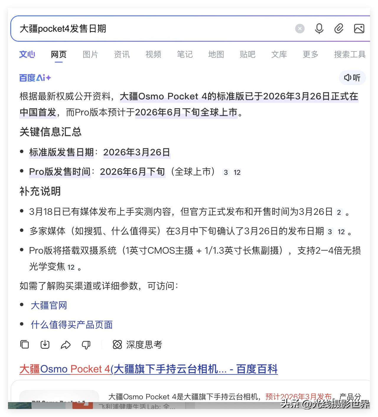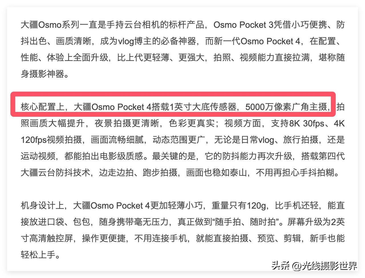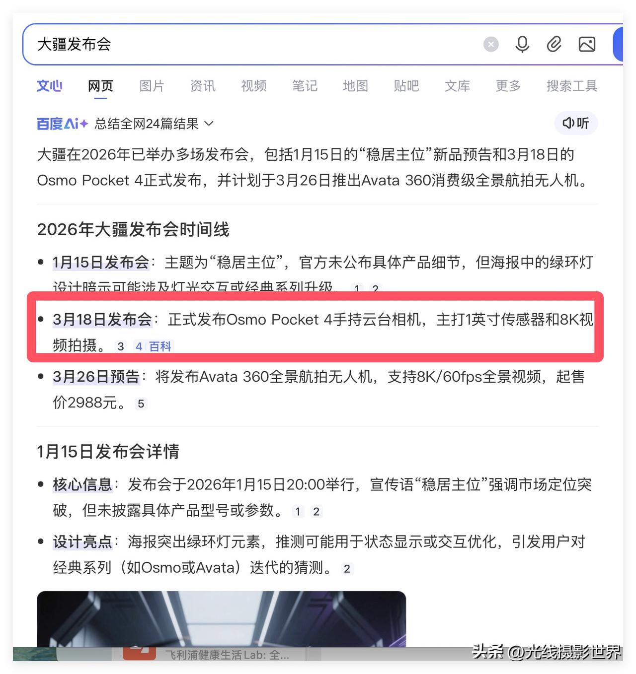 哎呀!真的是让人望眼欲穿啊!3月26日,大疆发布会,究竟会不会发布全新的Pocket 4甚至Pocket 4 Pro呢?!好像一些AI的回答也是抽风一样,可能被不可靠的信源给污染了吧?! 不得不说,2026年,大多数现场采访的记者媒体,好像都放弃了专业摄像机和索尼全画幅微单……拍照手机,大疆Pocket 3,大疆Action6……成为了主力军! 可惜,Pocket 3,没有长焦镜头……如果Pocket 4pro真的具备长焦镜头,恐怕各地融媒体中心的记者编辑……可能都会积极抢购,人手一台,自费购买……无需单位配发,哈哈哈! 2026年3月26日的大疆发布会……真的是太令人期待啦! 其实,大疆Pocket 4标准版,大家也没啥特别期待的…… 大家真正有期待的,主要还是Pocket 4 pro的长焦镜头……这个是刚需的刚需啊! 好吧……最近存储卡涨价太厉害了……硬盘涨价也很厉害……所以,其实,大多数人对于所谓的4k,6k,8k或者专业视频格式或者RAW格式视频,也没啥期待……真的是没啥必要啊! 但是,Pocket 4pro真的需要一个长焦镜头啊! 不过,鉴于Pocket 4的主摄像头的焦距不是很长……所以,Pocket 4pro的长焦镜头,也许不需要85mm,也许50-60mm即可……4800万像素的50-60mm的长焦镜头……数码变焦至85-135mm应该也有很强的可用性…… 如果Pocket 4pro补上长焦的短板……估计很多人都会放弃购买iphone18pro…… 对于短视频拍摄来说……对于现场采访来说……对于大多数日常的需要实拍的视频来说……相信,Pocket 4 pro应该是很够用了! 好吧,Pocket 3和4,没有长焦镜头……确实不好使了……如果大家都知道Pocket 4pro可能会有长焦镜头…… 拥有了长焦镜头的Pocket 4 pro……太棒啦! 光线摄影世界曾兰谈天说地