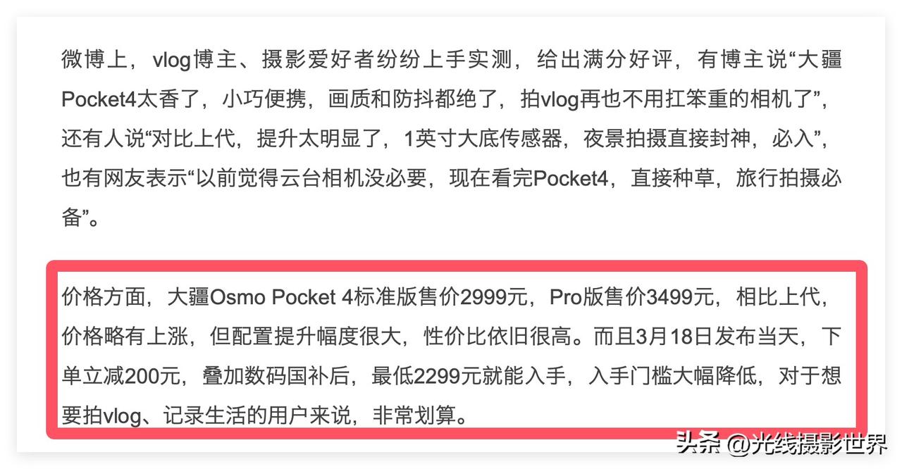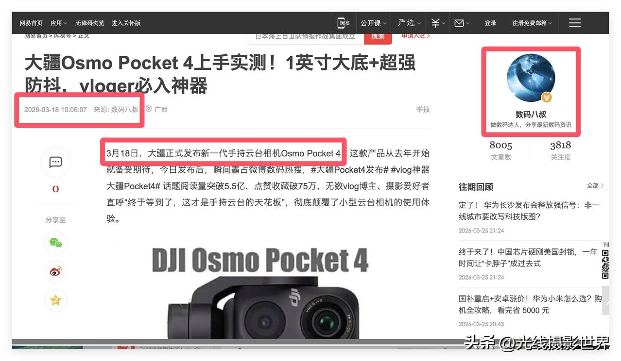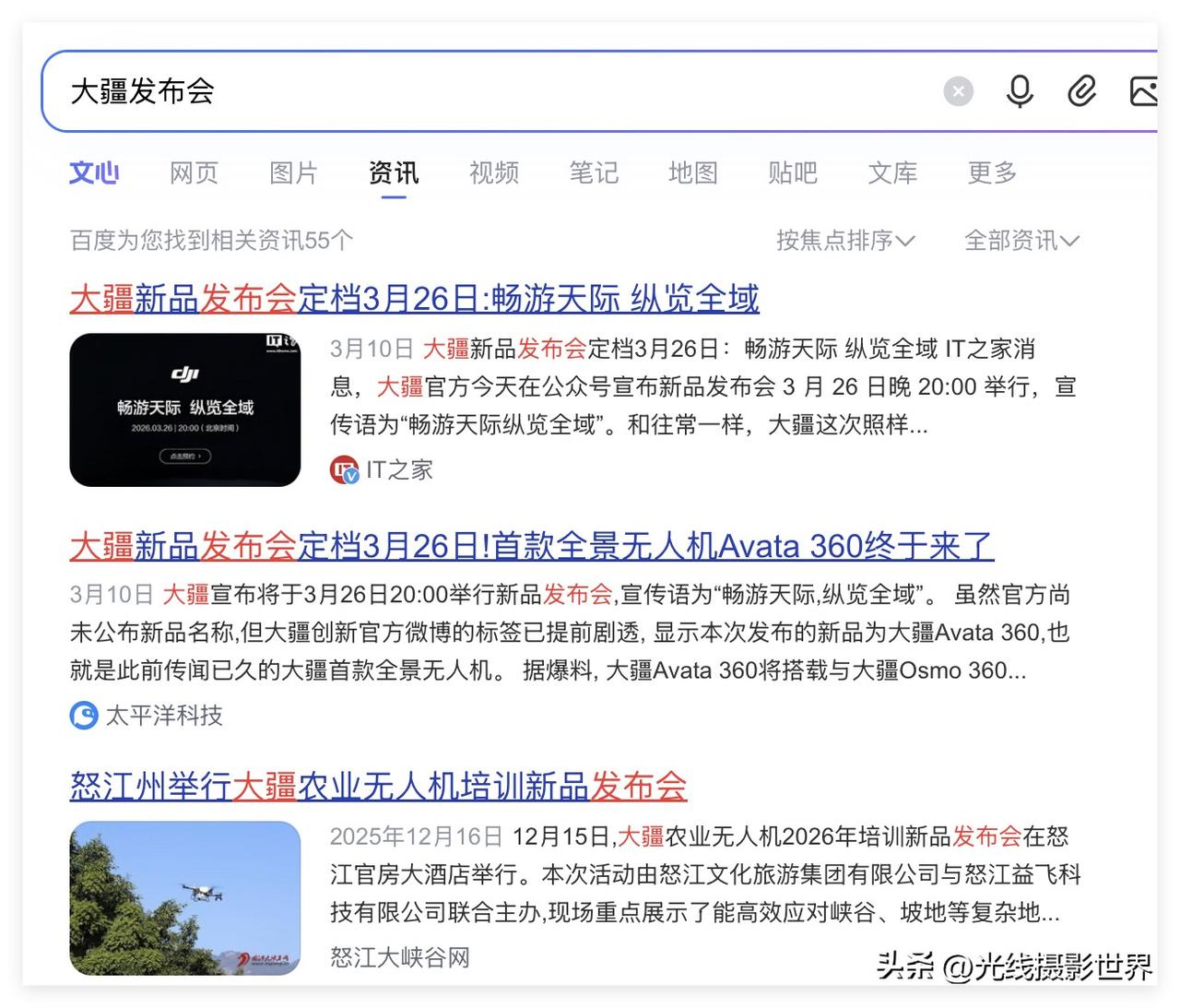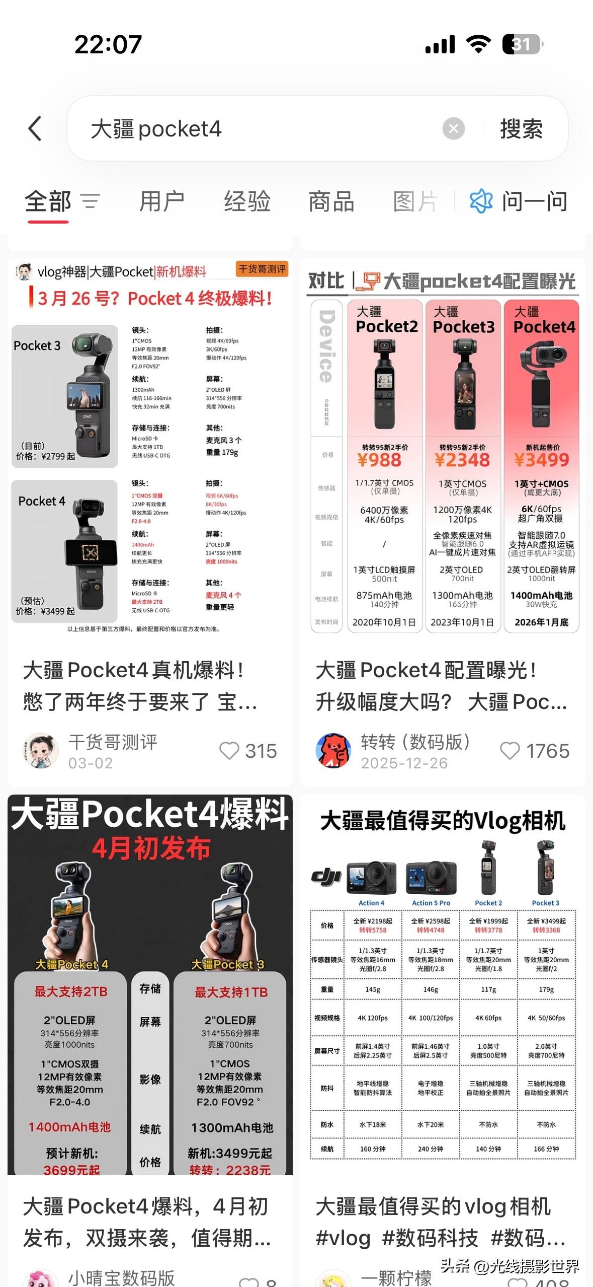 哎呀!真的是让人望眼欲穿啊!3月26日,大疆发布会,究竟会不会发布全新的Pocket 4甚至Pocket 4 Pro呢?!好像一些AI的回答也是抽风一样,可能被不可靠的信源给污染了吧?! 不得不说,2026年,大多数现场采访的记者媒体,好像都放弃了专业摄像机和索尼全画幅微单……拍照手机,大疆Pocket 3,大疆Action6……成为了主力军! 可惜,Pocket 3,没有长焦镜头……如果Pocket 4pro真的具备长焦镜头,恐怕各地融媒体中心的记者编辑……可能都会积极抢购,人手一台,自费购买……无需单位配发,哈哈哈! 2026年3月26日的大疆发布会……真的是太令人期待啦! 其实,大疆Pocket 4标准版,大家也没啥特别期待的…… 大家真正有期待的,主要还是Pocket 4 pro的长焦镜头……这个是刚需的刚需啊! 好吧……最近存储卡涨价太厉害了……硬盘涨价也很厉害……所以,其实,大多数人对于所谓的4k,6k,8k或者专业视频格式或者RAW格式视频,也没啥期待……真的是没啥必要啊! 但是,Pocket 4pro真的需要一个长焦镜头啊! 不过,鉴于Pocket 4的主摄像头的焦距不是很长……所以,Pocket 4pro的长焦镜头,也许不需要85mm,也许50-60mm即可……4800万像素的50-60mm的长焦镜头……数码变焦至85-135mm应该也有很强的可用性…… 如果Pocket 4pro补上长焦的短板……估计很多人都会放弃购买iphone18pro…… 对于短视频拍摄来说……对于现场采访来说……对于大多数日常的需要实拍的视频来说……相信,Pocket 4 pro应该是很够用了! 好吧,Pocket 3和4,没有长焦镜头……确实不好使了……如果大家都知道Pocket 4pro可能会有长焦镜头…… 拥有了长焦镜头的Pocket 4 pro……太棒啦! 光线摄影世界曾兰谈天说地
