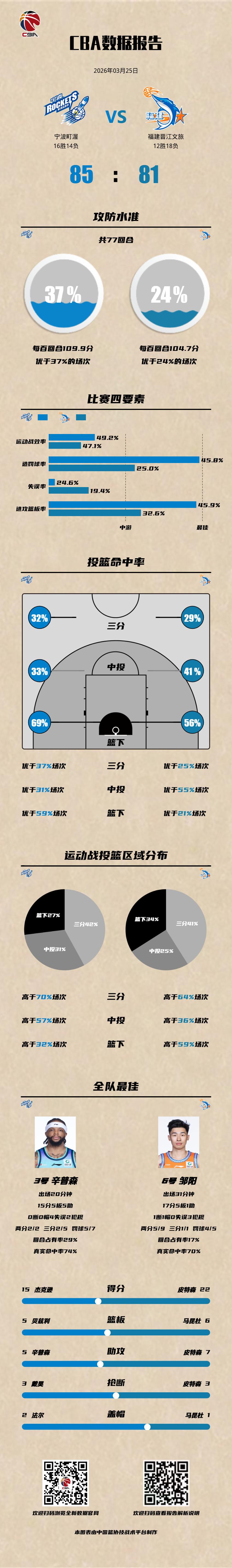宁波町渥 85-81 福建晋江文旅 宁波男篮vs福建男篮 宁波町渥:辛普森15分5篮板5助攻,杰克逊15分,法尔11分5篮板2盖帽; 福建晋江文旅:皮特森22分3篮板7助攻3抢断,邹阳17分5篮板,杨曦皓11分5篮板。以城之名