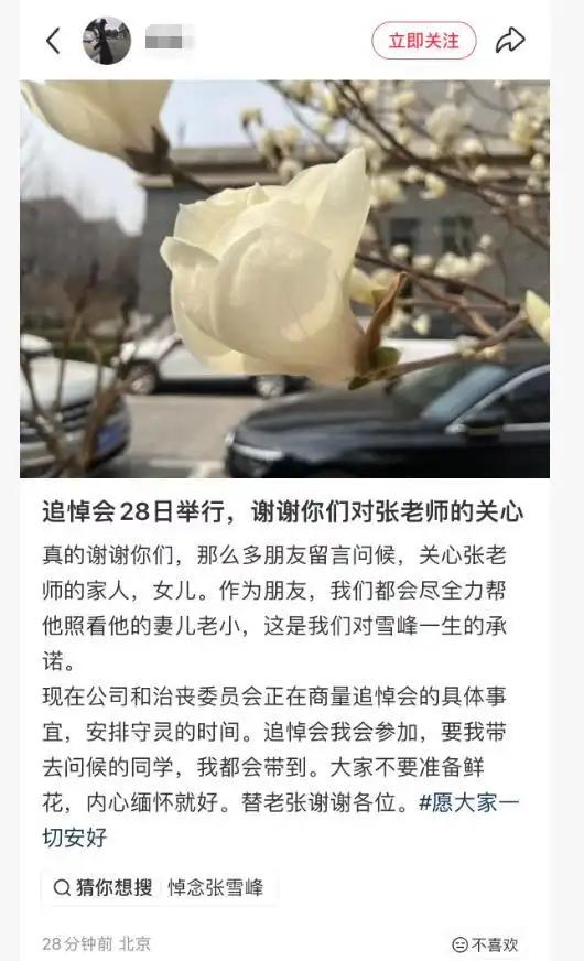 张雪峰好友透露追悼会相关事宜,一个细节让人感动。 原来追悼会定在3月28日举行,好友替张雪峰感谢了大家的关心。 同时好友表示,会全身心的帮助张雪峰照顾妻儿老小的,这是对他一辈子的承诺。 其实张雪峰去世后,大家最担心的就是他年仅11岁的女儿,如今看到有好友陪伴,能让人稍稍放心一点了。 同时好友还表示,希望大家不要准备鲜花,内心缅怀就好了。 俗话说:“人以群分,物以类聚”,张雪峰之所以能成名,就是因为他的善良,总是为别人考虑,如今他的好友亦是如此。 也许好友想到大家都想送张雪峰老师最后一程,不想让大家铺张浪费,所以才提醒了大家不要买鲜花。