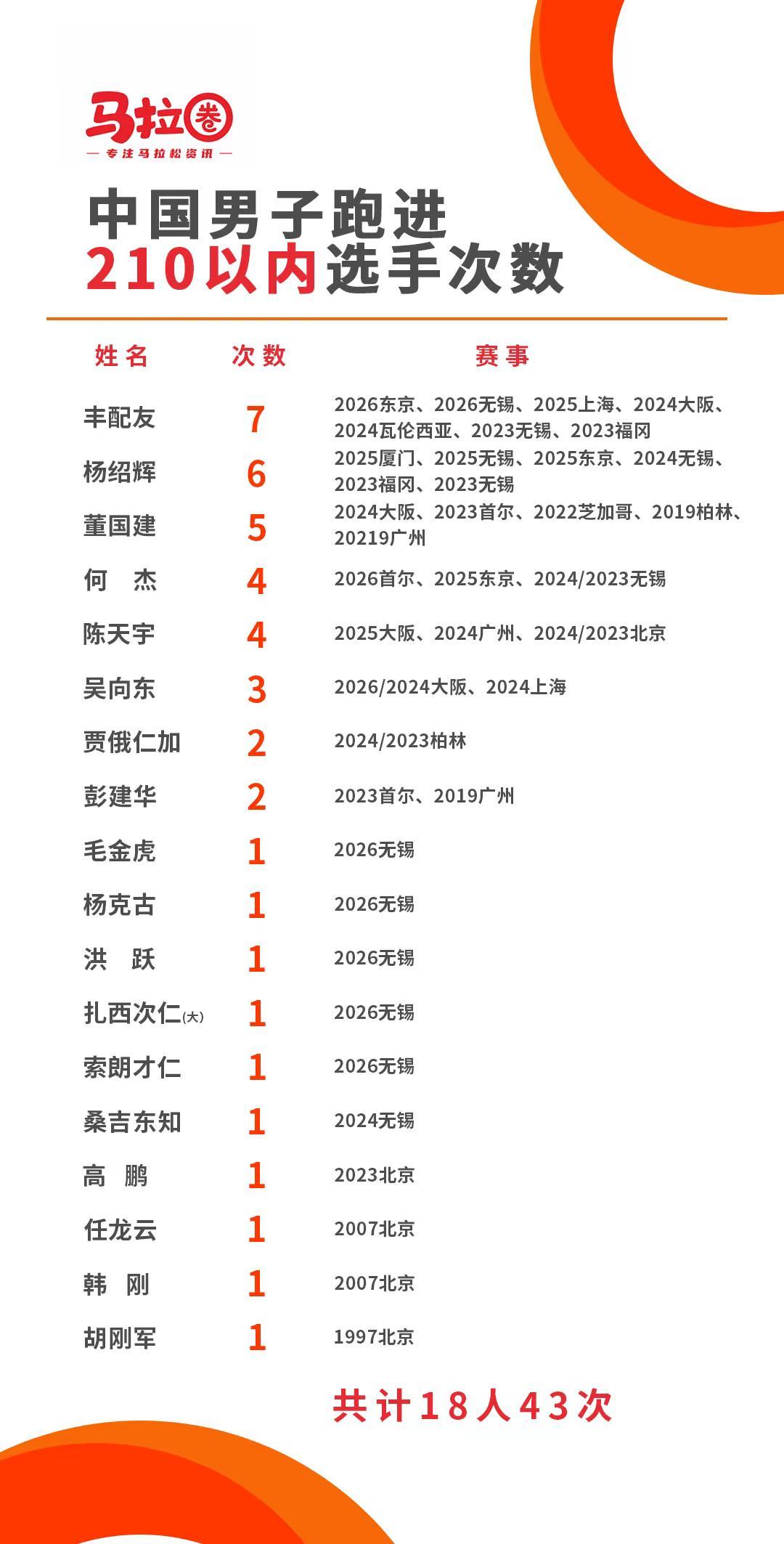 中国马拉松18人43次跑进210大关。中国男子马拉松历史共计18人43次跑进2小时10分。其中,丰配友7次,杨绍辉6次,董国建5次,何杰和陈天宇4次,吴向东3次,贾俄仁加和彭建华2次,其余选手均是1次。从2023年3月19日到2026年3月22日,中国男子马拉松共计36次跑进210。其中,无锡13次,大阪5次,北京3次,广州3次,东京3次,首尔3次,柏林3次,上海2次,福冈2次,其余赛事均是1次。历史前十除任龙云外均是现役选手,2007年后,董国建是首位跑进210的选手(2019年柏林马拉松),彭建华是第2位(2019广州马拉松)。何杰是首位跑进208和207的选手,丰配友是首位跑进206的选手,毛金虎是首位首马跑进210的选手,贾俄仁加是首位跑进210的体制外选手。从2023年3月19日到2026年3月1日,不到3年时间,全国纪录4次被刷新,其中何杰2次,杨绍辉1次,丰配友1次。你看好谁再次打破中国男子马拉松全国纪录?成绩是多少?近几年,你看好哪些选手跑进210?马拉圈