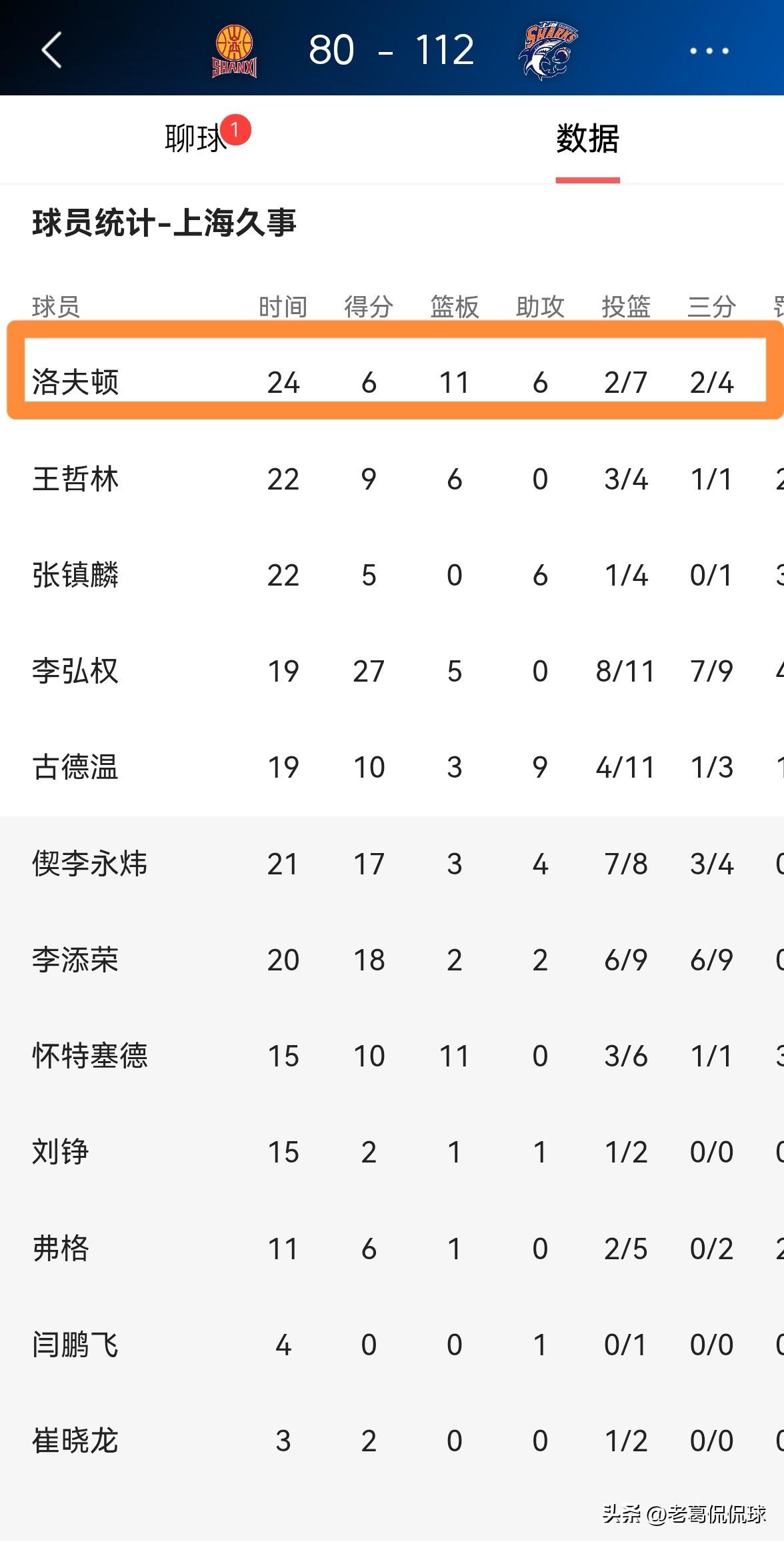 上海久事大外援洛夫顿又放水了!在今天上海久事客场以112:80轻取山西汾酒的比赛中,洛夫顿在进攻端完全没有发力,他在首发出战的24分钟,投篮7中2,其中三分球4中2得到6分11篮板6助攻,还有7次失误和4次犯规。 坦白说,本场比赛洛夫顿在攻防两端的注意力都不够集中,他的很多传球都显得非常随意,他完全没有在认真打球。