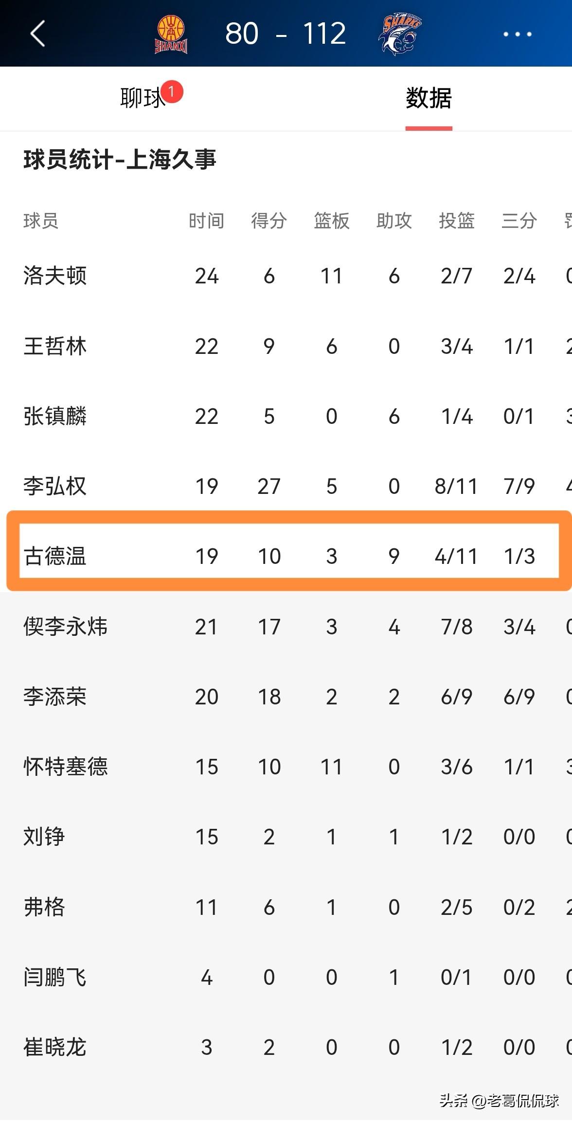 上海久事外援古德温真是太狠心了!在今天上海久事客场以112:80大胜山西汾酒的比赛中,古德温面对旧主毫不手软,他在进攻端展现出了非常强烈的得分欲望,最终帮助球队送给了老东家一场惨败。 整场比赛下来,古德温首发出战19分钟,投篮11中4,其中三分球3中1、罚球2中1得到10分3篮板9助攻,他的场上正负值为+13。