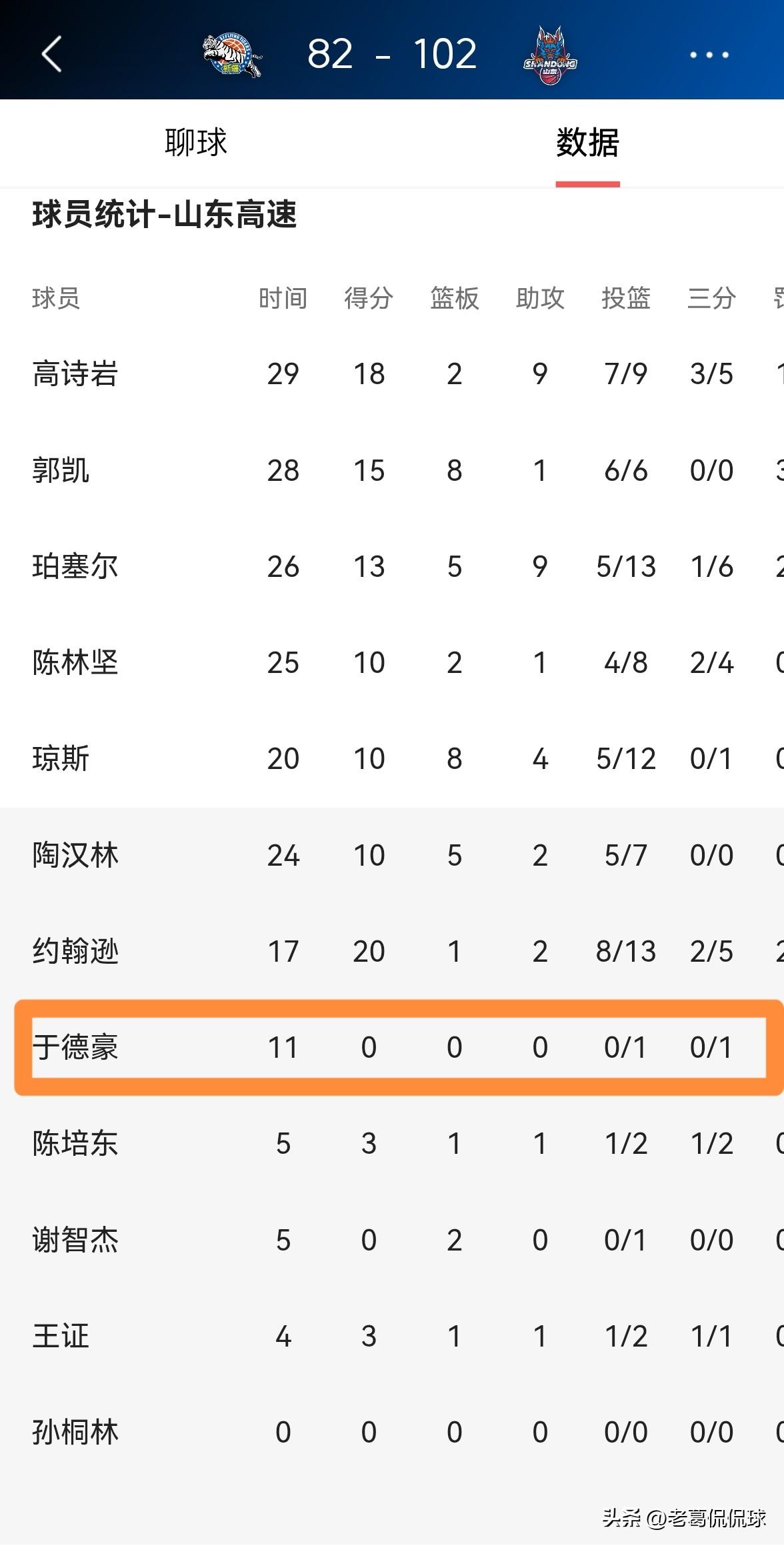 山东高速大将于德豪真是太懂事了!在今天山东高速客场挑战新疆伊犁特的比赛中,故地重游的于德豪面对旧主不忍心痛下杀手,他最终怒砍0分。 整场比赛下来,于德豪替补出战11分钟,投篮1中0怒砍0分0篮板0助攻,还有2次犯规。 老实说,于德豪确实非常的懂事,他深知老东家的实力不强,因此他在场上完全没有进攻欲望。