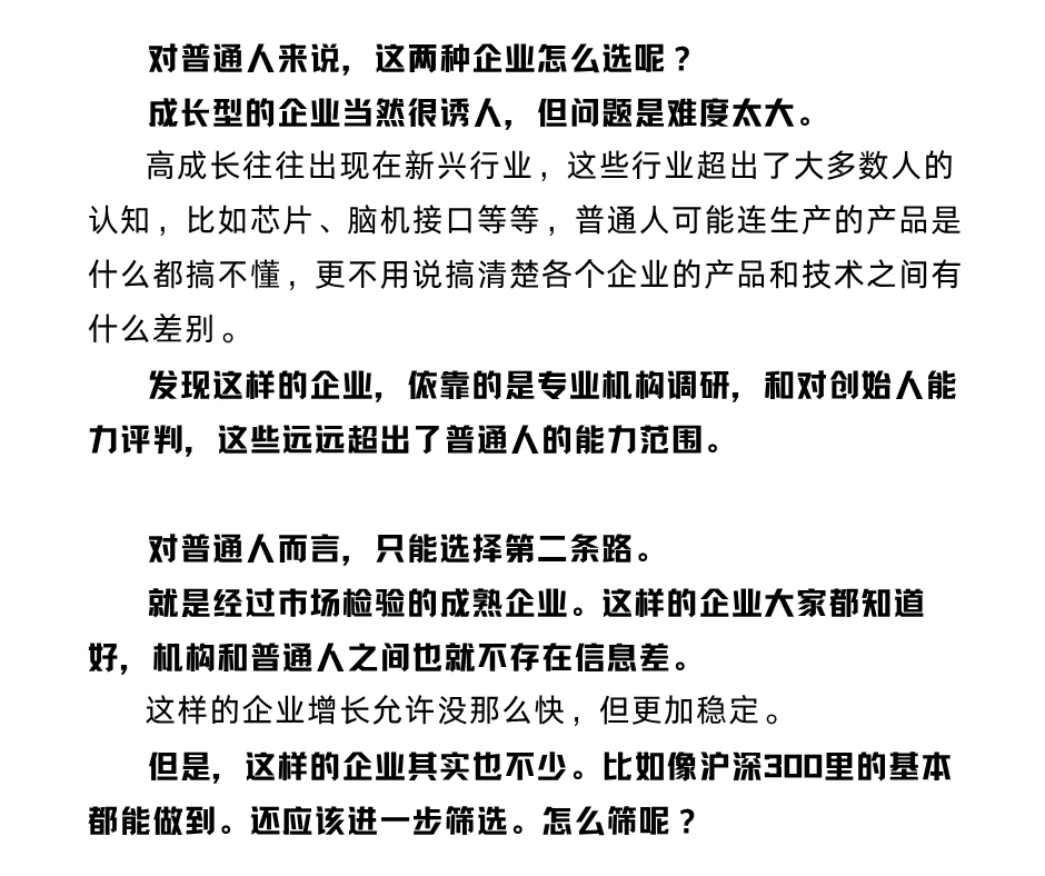 成长型的企业当然很诱人,但问题是难度太大。高成长往往出现在新兴行业,这些行业超出了大多数人的认知,比如芯片、脑机接口等等,普通人可能连生产的产品是什么都搞不懂,更不用说搞清楚各个企业的产品和技术之间有什么差别。