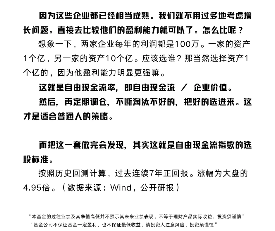 而把这一套做完会发现,其实这就是自由现金流指数的选股标准。按照历史回测计算,过去连续7年正回报。涨幅为大盘的4.95倍。(数据来源:Wind,公开研报,华夏基金)