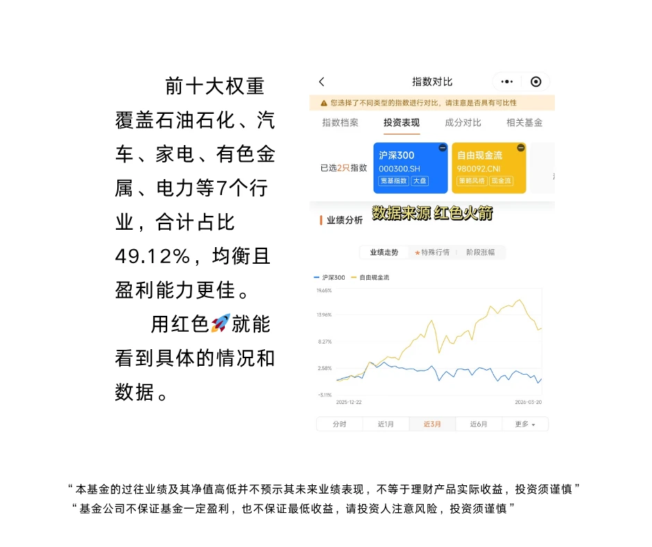前十大权重覆盖石油石化、汽车、家电、有色金属、电力等7个行业,合计占比49.12%,均衡且盈利能力更佳。用红色🚀就能看到具体的情况和数据。