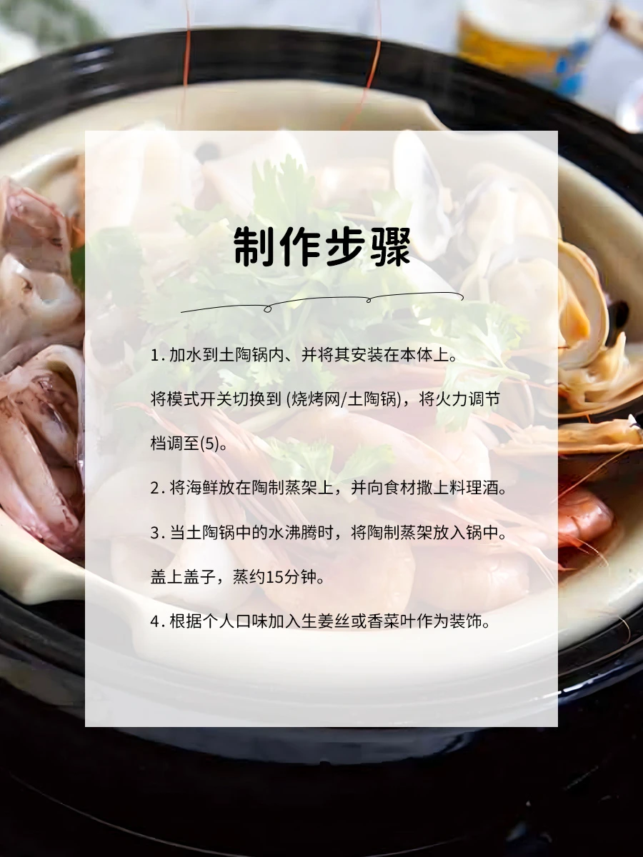 1️⃣ 土陶锅里加水,装好本体,模式切到“烧烤网/土陶锅”,火力调到5