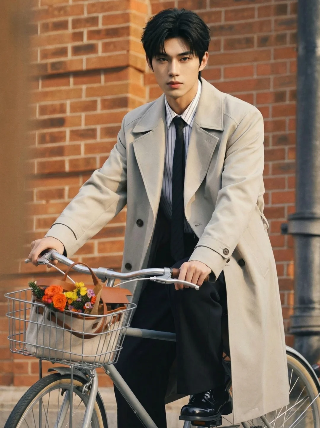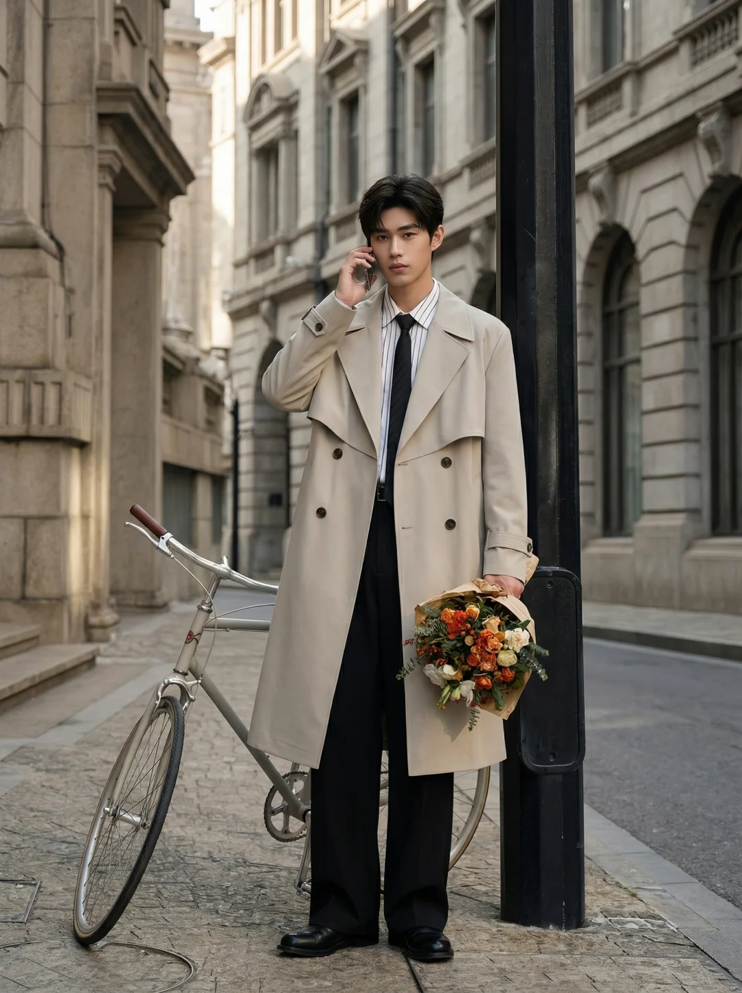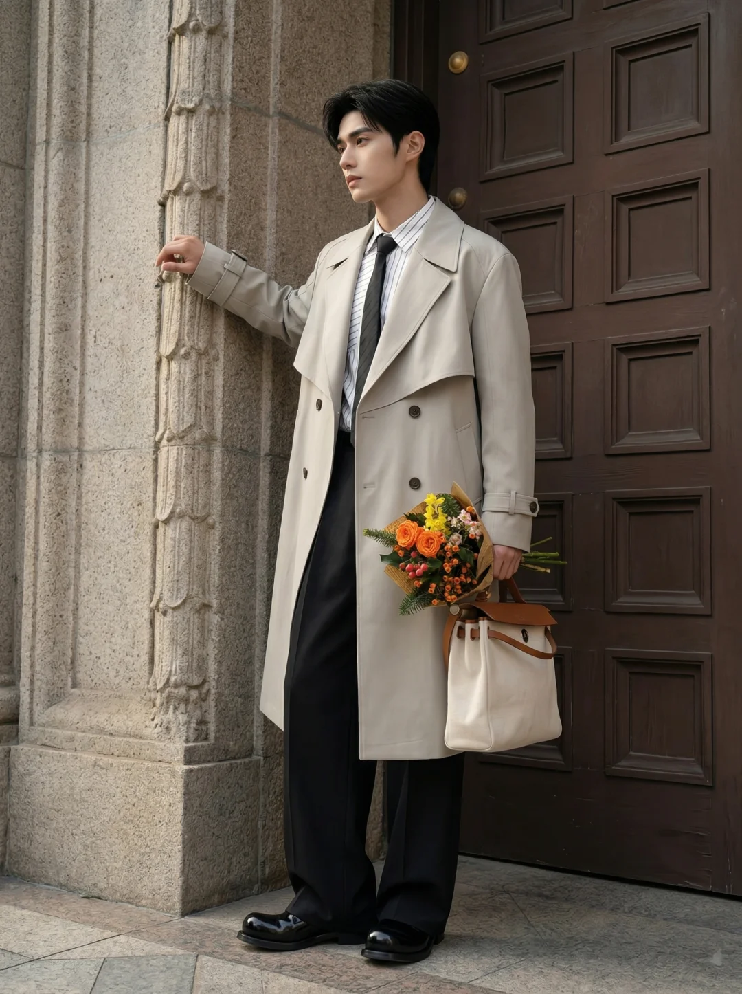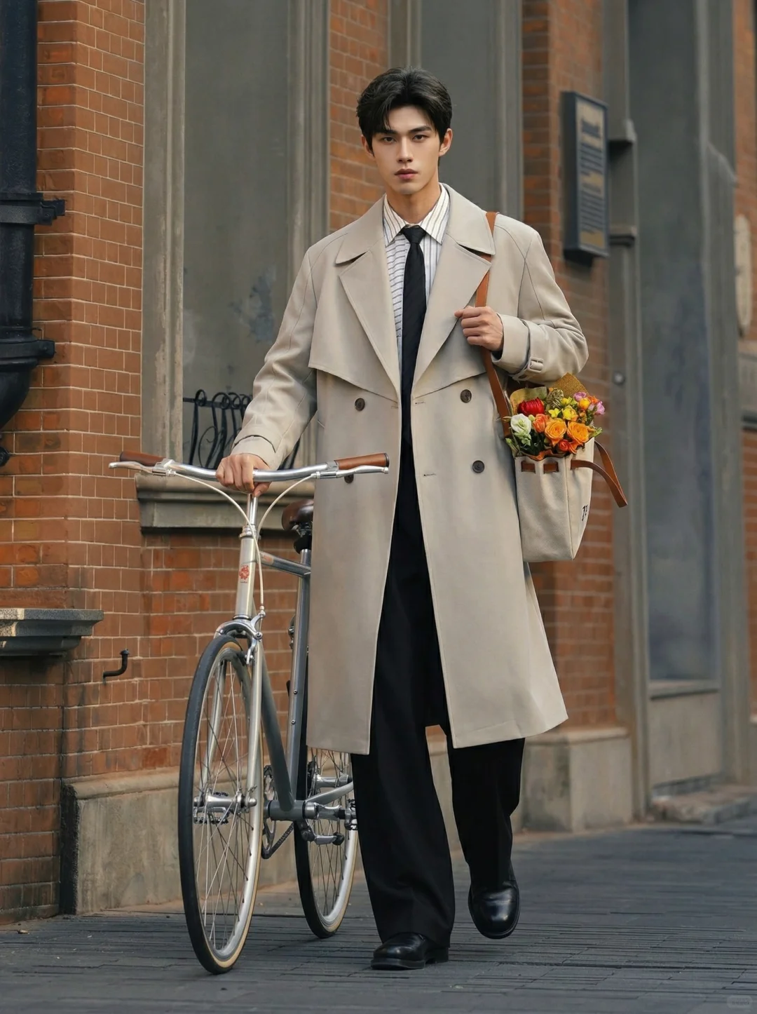 在这个浪漫不需要被定义的季节, 一件长风衣,就是男孩最得体的温柔。🍂 选择了低饱和度的米灰色中长款风衣,廓形挺括却不刻板。那种大领口的设计,自带一种“走路带风”的电影氛围感。 比起纯色衬衫,条纹衬衫增加了视觉的纵深感,领口微敞,内搭黑色领带,是那种禁欲又克制的职场精英与文艺青年的结合体。直筒垂坠感休闲裤,修饰腿型的同时,也中和了风衣的厚重,让整体重心向下,显得整个人更加稳重、松弛。 穿上它,去见那个想见的人吧。 毕竟,春天和长风衣,本身就是一场浪漫。
