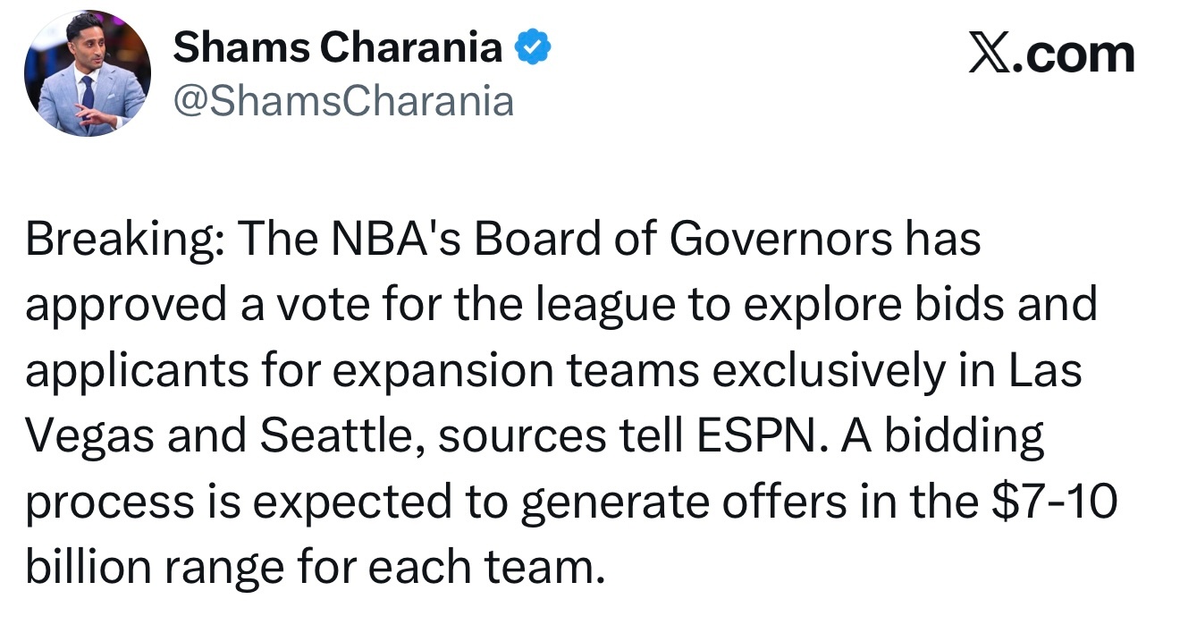 Shams:突发新闻!NBA董事会已批准在拉斯维加斯和西雅图新增球队进行招标。预计每支球队的竞标金额将达到70-100亿美元。