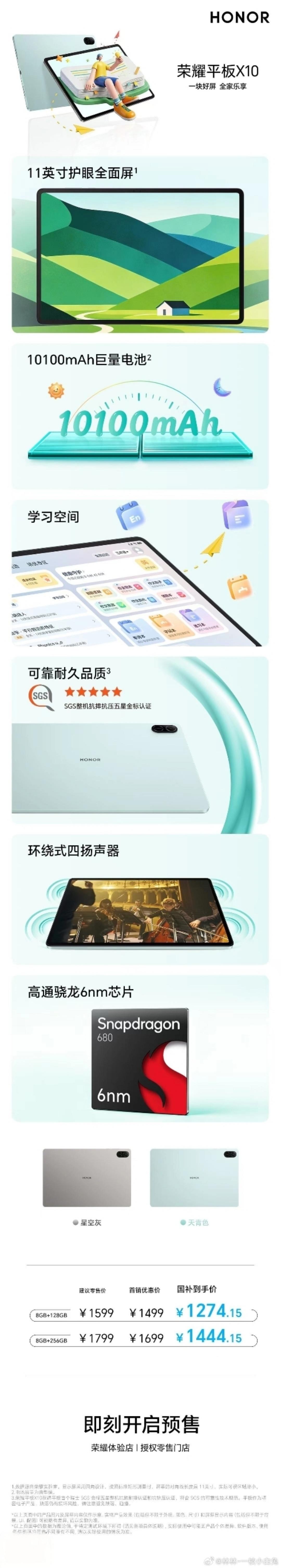荣耀平板X10这波操作,实属是有些“不讲武德”,算是把成功千元机市场的遮羞布扯下来了。 当友商还在吹什么旗舰芯片跑分多高时,荣耀直接炸出10100mAh电池和护眼屏,摆明了告诉你:这个价位续航和体验才是硬道理。骁龙680确实不强,但配上一块90Hz的护眼屏,给老人看剧给孩子上网课,还是绰绰有余。首发1299元的价格,国补还能再便宜两百,这刀法精准得让人没话说。与其买个四不像,不如把钱花在刀刃上,这板子性价比确实到位,荣耀这招走得挺稳。