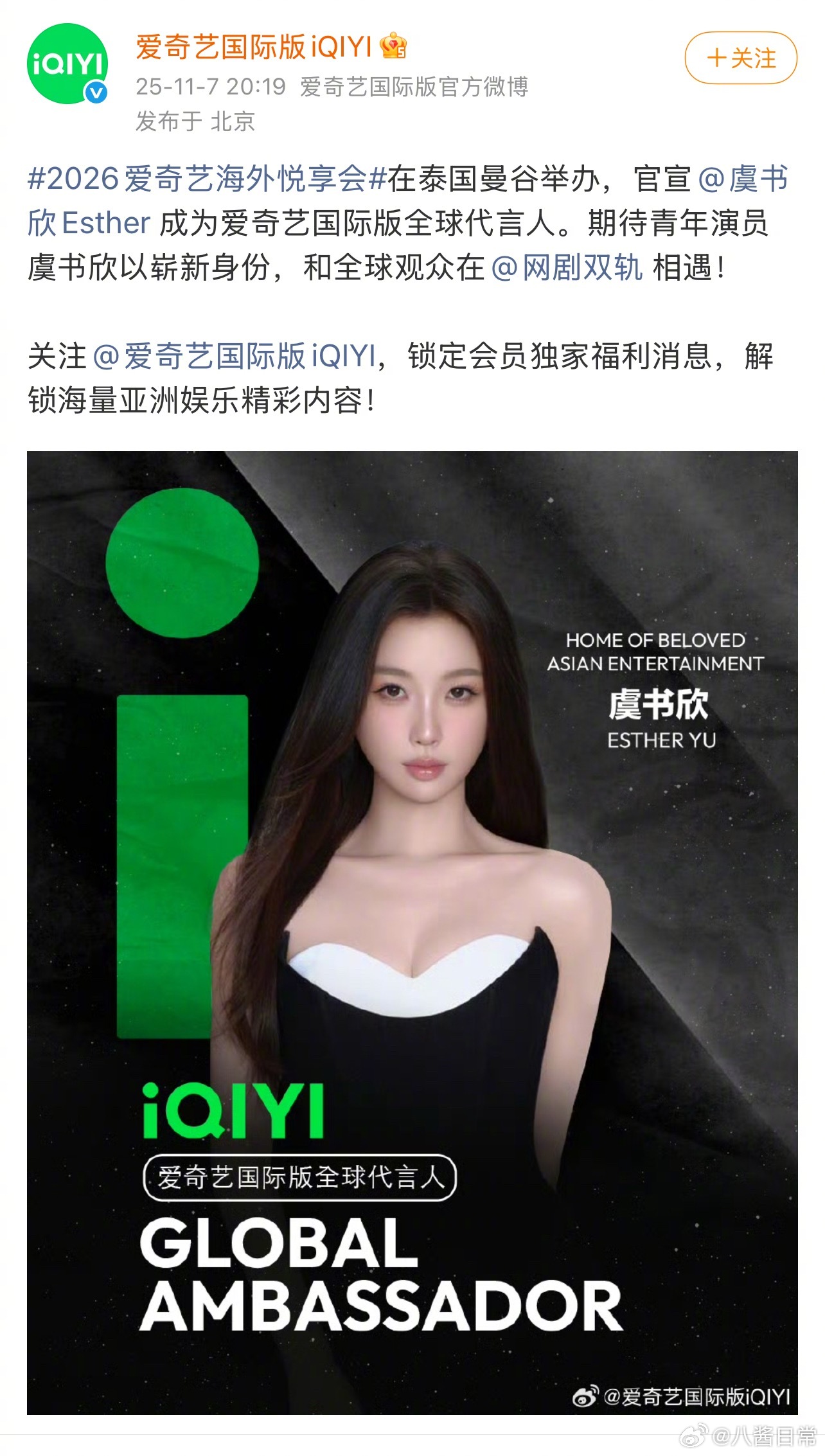 爱奇艺国际版代言人:陈哲远、虞书欣、丞磊