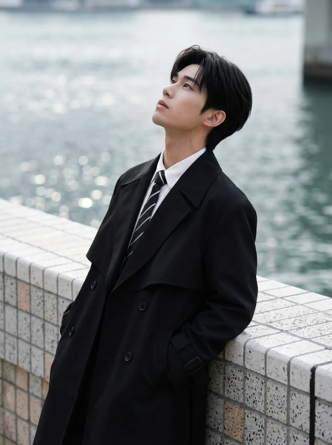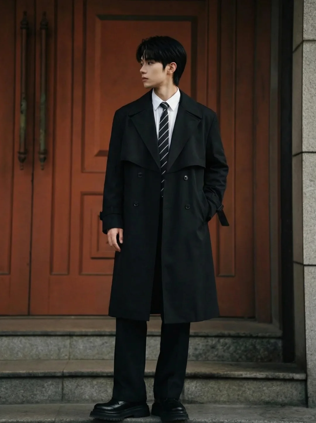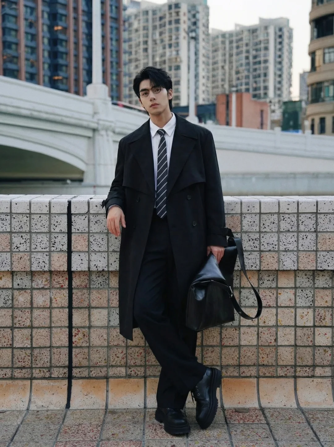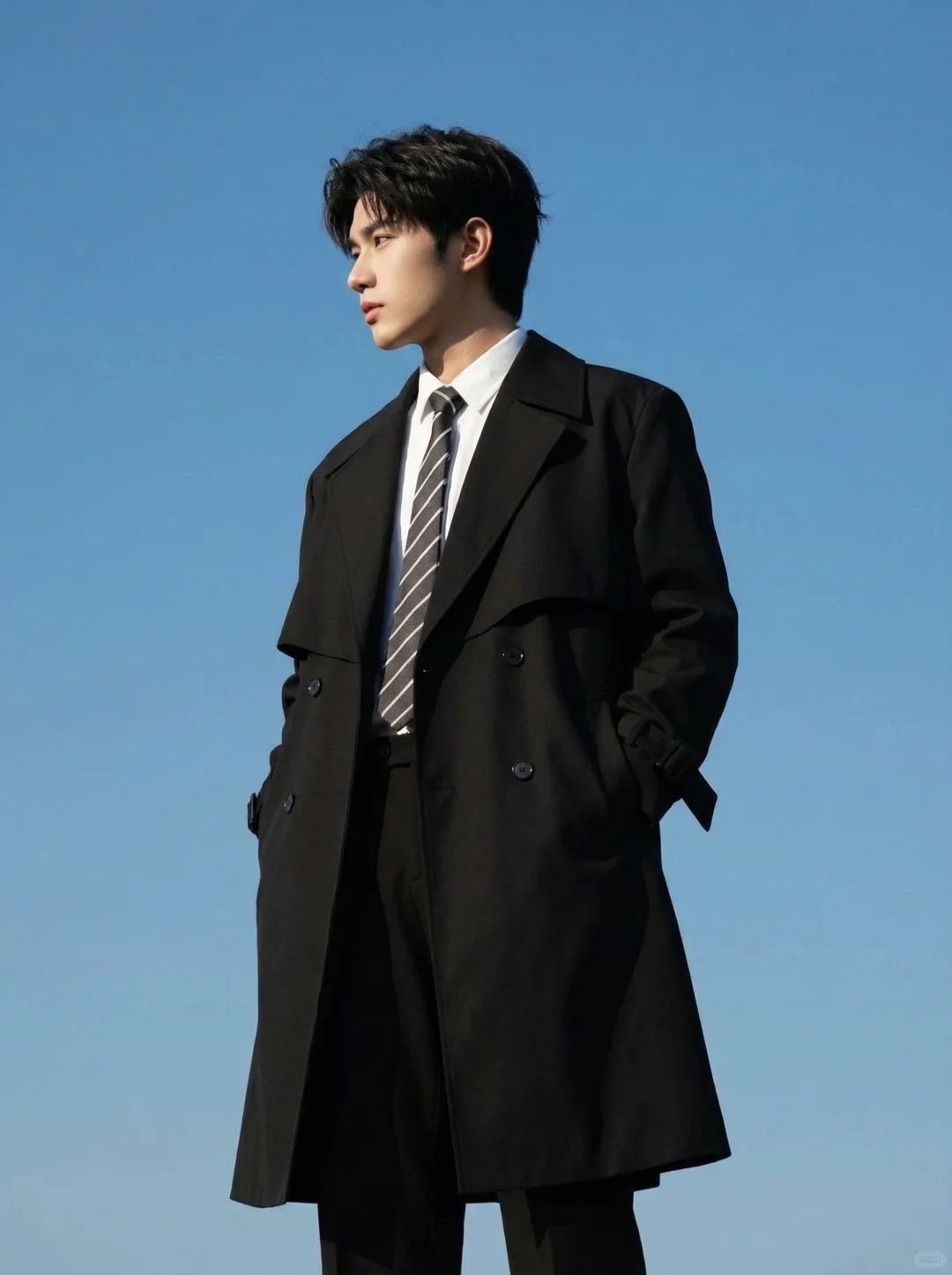 穿西装太板正像去开会,穿卫衣又太随意,完全找不到通勤和约会的平衡点… 直到挖到这套黑风衣穿搭!这件飘带黑风衣是我最近的心头好,挺括的版型藏肉又显高,长度刚好到小腿,走路带风的氛围感直接拉满。内搭白衬衫 + 条纹领带,不用费心搭配,瞬间就有了精致感,不会太正式又很有质感。同色系直筒裤视觉上拉长腿型,175 穿也能轻松 get 大长腿,和风衣适配度 100%。再踩一双厚底皮鞋,增高又稳重,上周穿去上班被同事追着问链接,周末和朋友去江边散步,原相机直出都好看📸现轻松拿捏干净利落的少年感!再也不用为穿什么发愁了