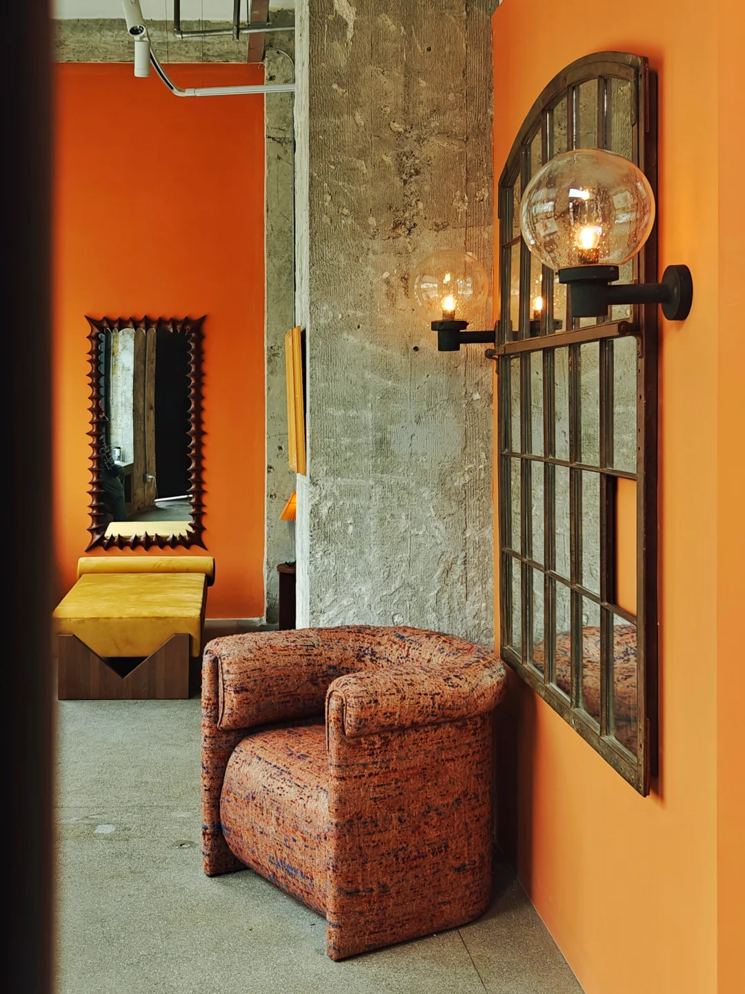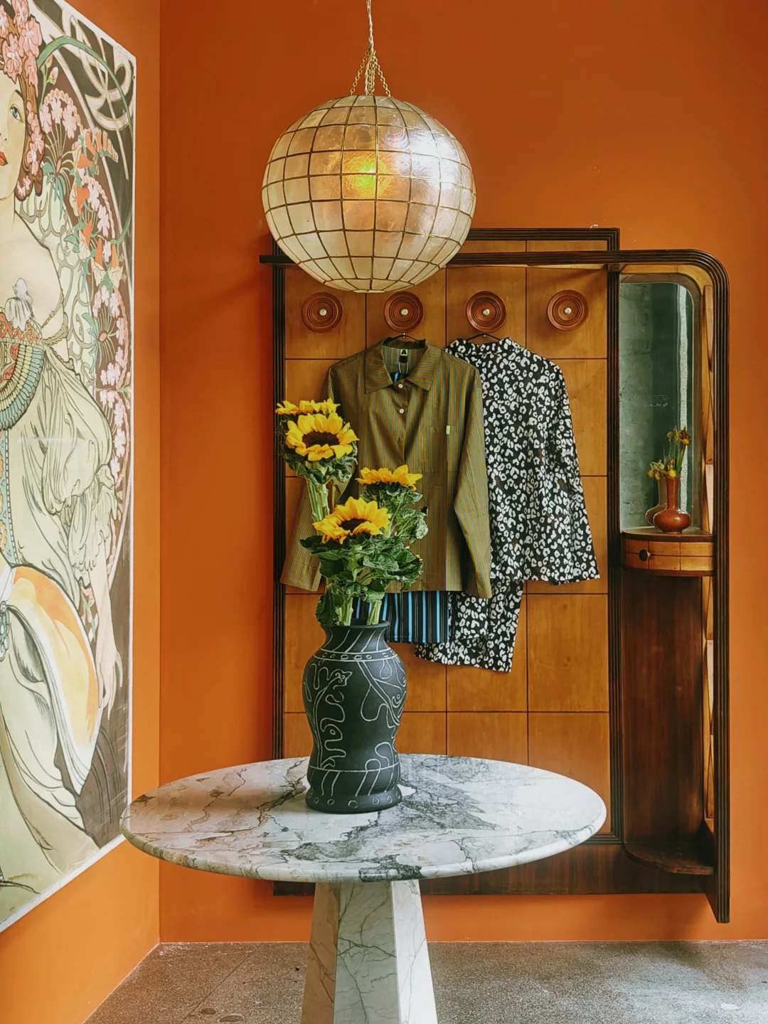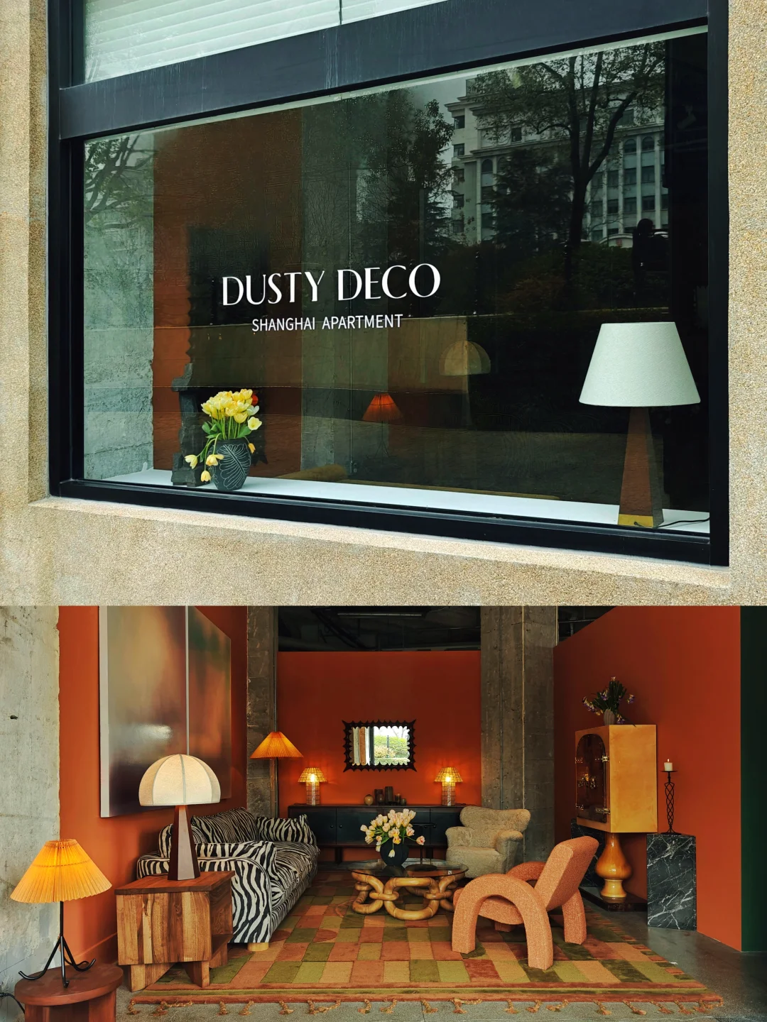 🟠这一次的变成我不认识的样子了,一打开黑色铁门看到的是手绘的巨幅复刻Mucha作品《四季·夏》,奠定了这次特展明艳又色彩丰富的基调,原本的工业冷峻风被橙色、绿色与蓝色的隔断墙完全遮蔽。玄关、客厅、餐厅、书房、卧室,一间一间地复原了源自瑞典斯德哥尔摩的复古家居与设计品牌Dusty Deco在马略卡岛上的公寓之内的情境。