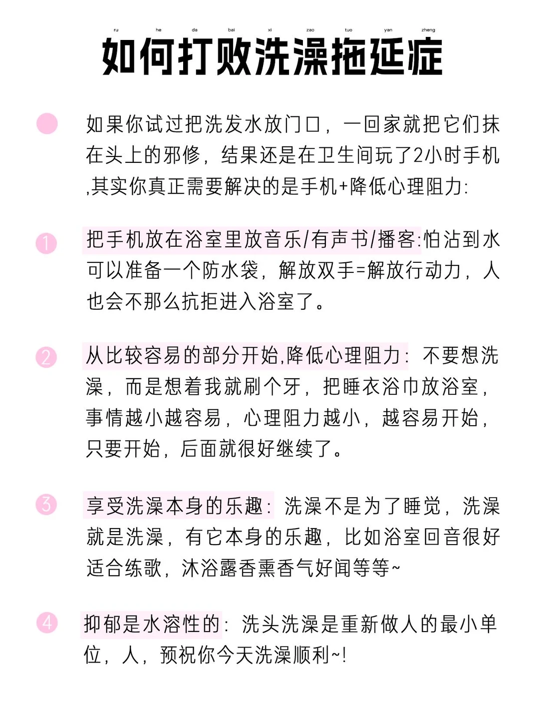 [二R]从比较容易的部分开始,降低心理阻力:不要想洗澡,而是想着我就刷个牙,把睡衣浴巾放浴室,事情越小越容易,心理阻力越小,越容易开始,只要开始,后面就很好继续了。