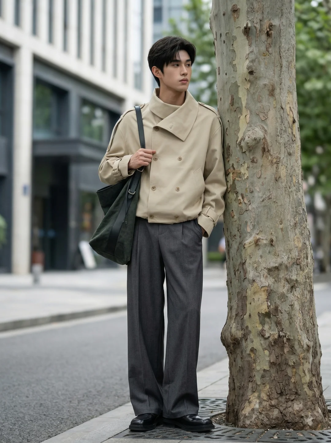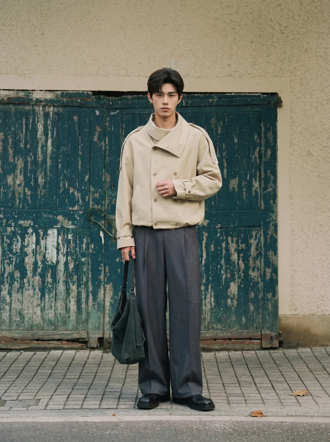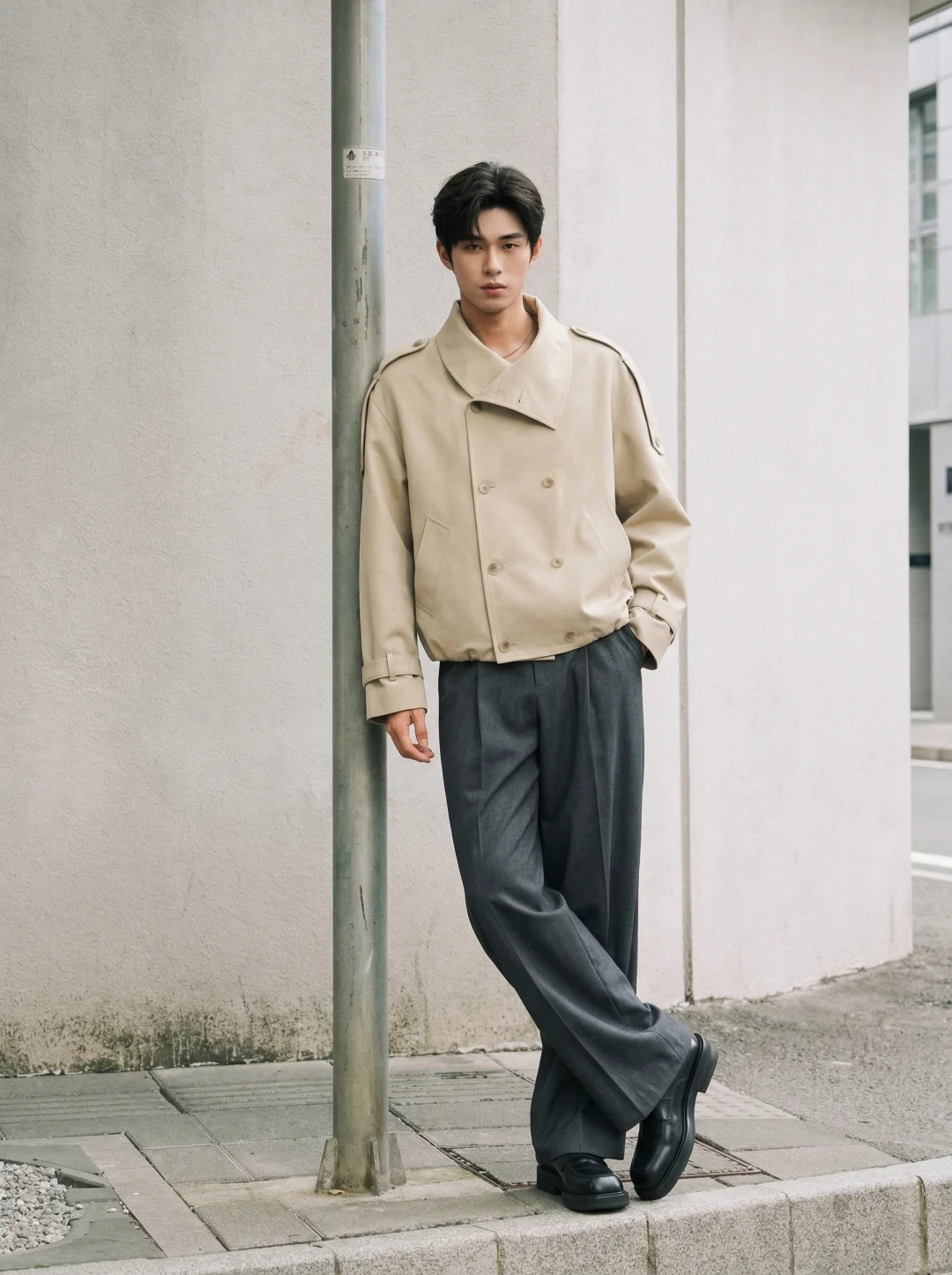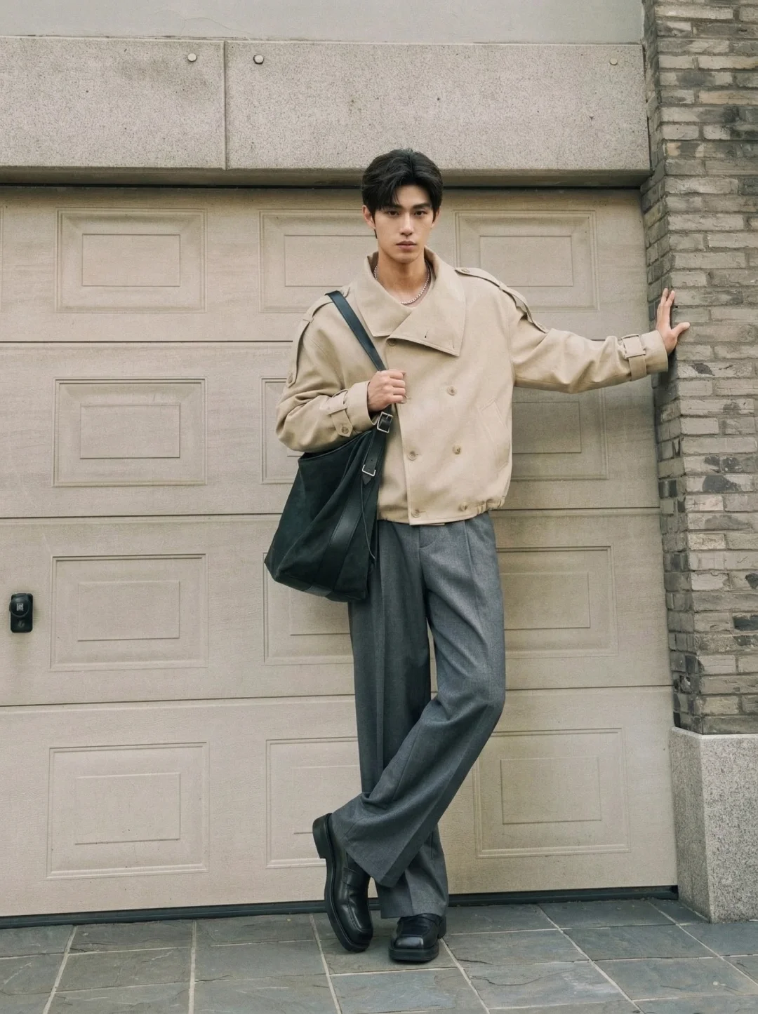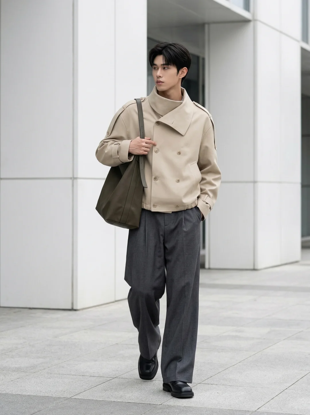 比起“穿得好看”,我更在意穿得有智性的松弛感。 尤其是像今天这种浅卡其系,但这件短款双筒章夹克的立领结构,在视觉上直接帮我撑起了整个人的骨架感。不像西装那么刻板,也不像卫衣那么随意。领口那种恰到好处的几何弧度,刚好把颈部线条修饰得很干净。灰色的双褶阔腿裤是我心目中“都市漫游”的最佳底色。这种低饱和度的碰撞,不张扬,但路人扫一眼就知道你对质感是有要求的。这件夹克的长度刚好卡在腰线以上,对我这种追求“黄金比例”的人来说非常友好。内搭一件极简的翻领白衬衫,那种层次感不是堆砌出来的,而是自然流露的松弛。就是松弛感“不用用力过猛,也能赢很大。”