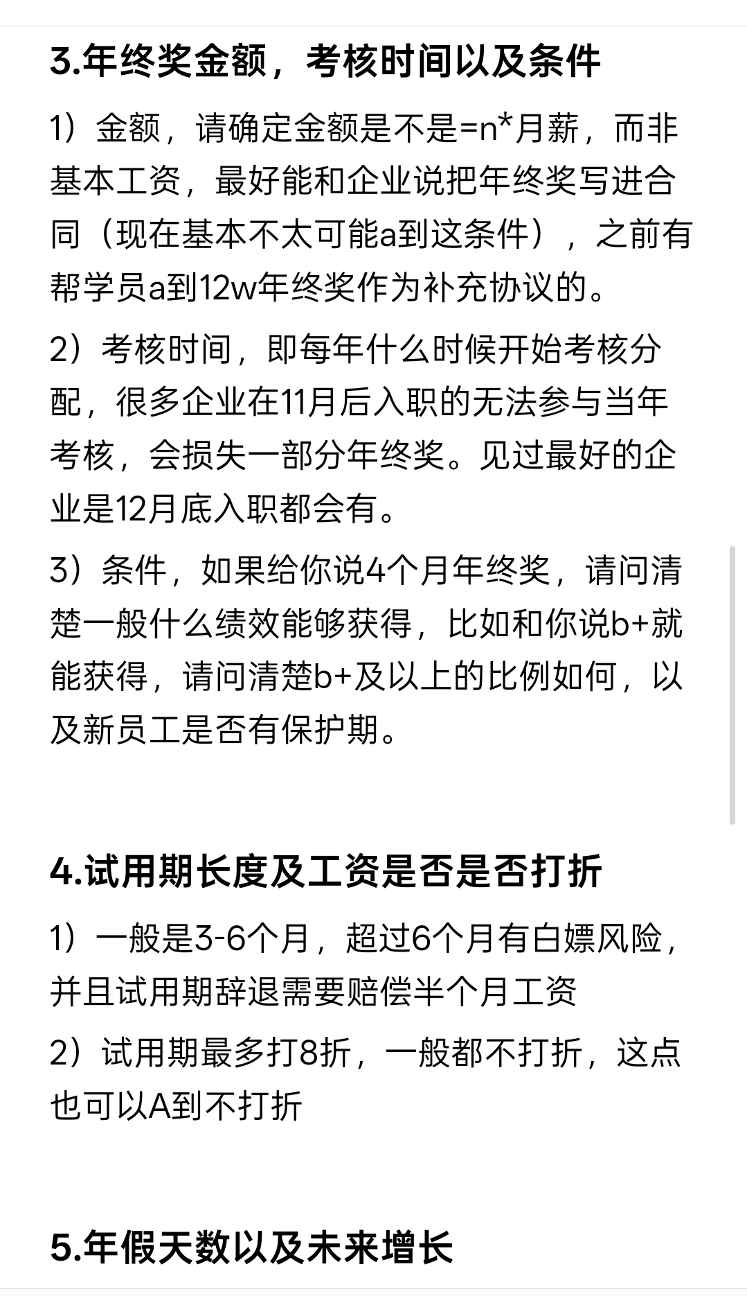 1)金额,请确定金额是不是=n*月薪,而非基本工资,最好能和企业说把年终奖写进合同(现在基本不太可能a到这条件),之前有帮学员a到12w年终奖作为补充协议的。