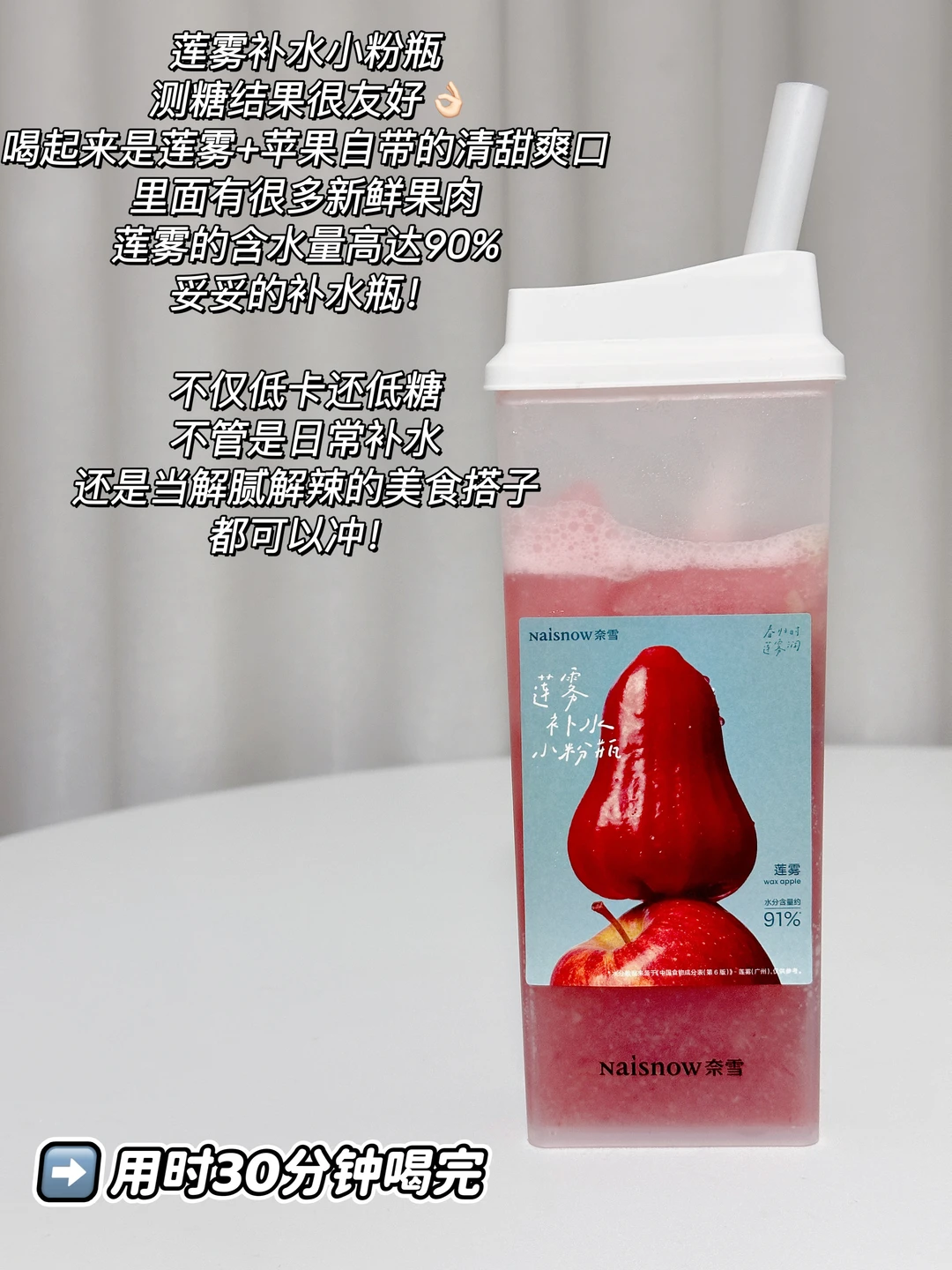 莲雾补水小粉瓶,测糖结果很友好👌🏻喝起来是莲雾+苹果自带的清甜爽口,里面有很多新鲜果肉,莲雾的含水量高达90%,妥妥的补水瓶!