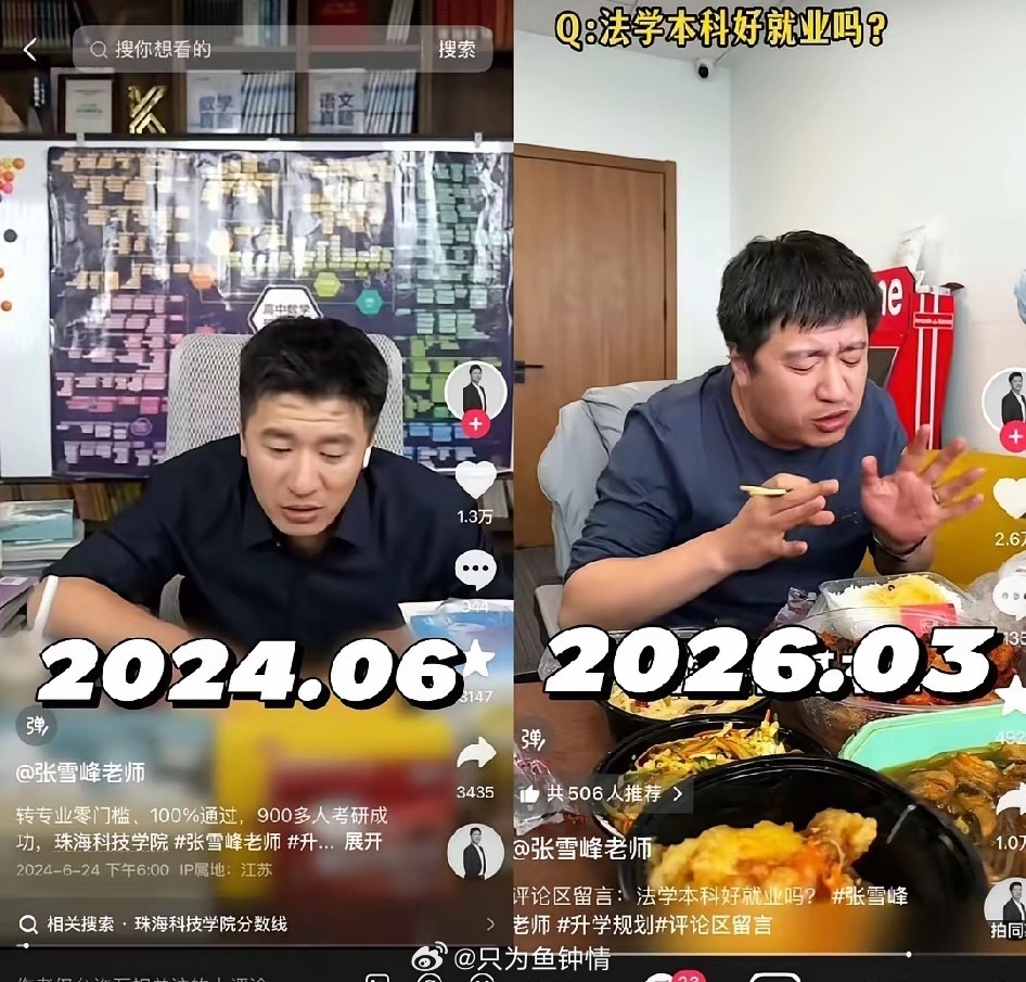 看张雪峰这几年面相的和体重的变化,他胖了不少,经常还边吃外卖边直播。熬夜工作,