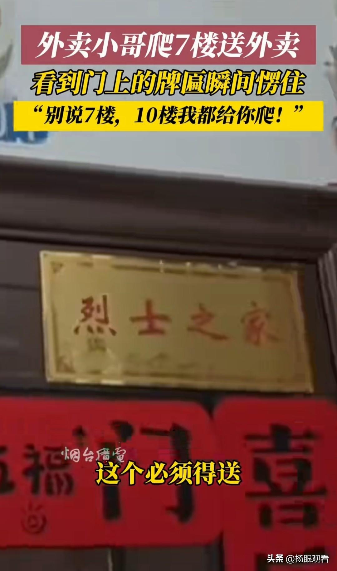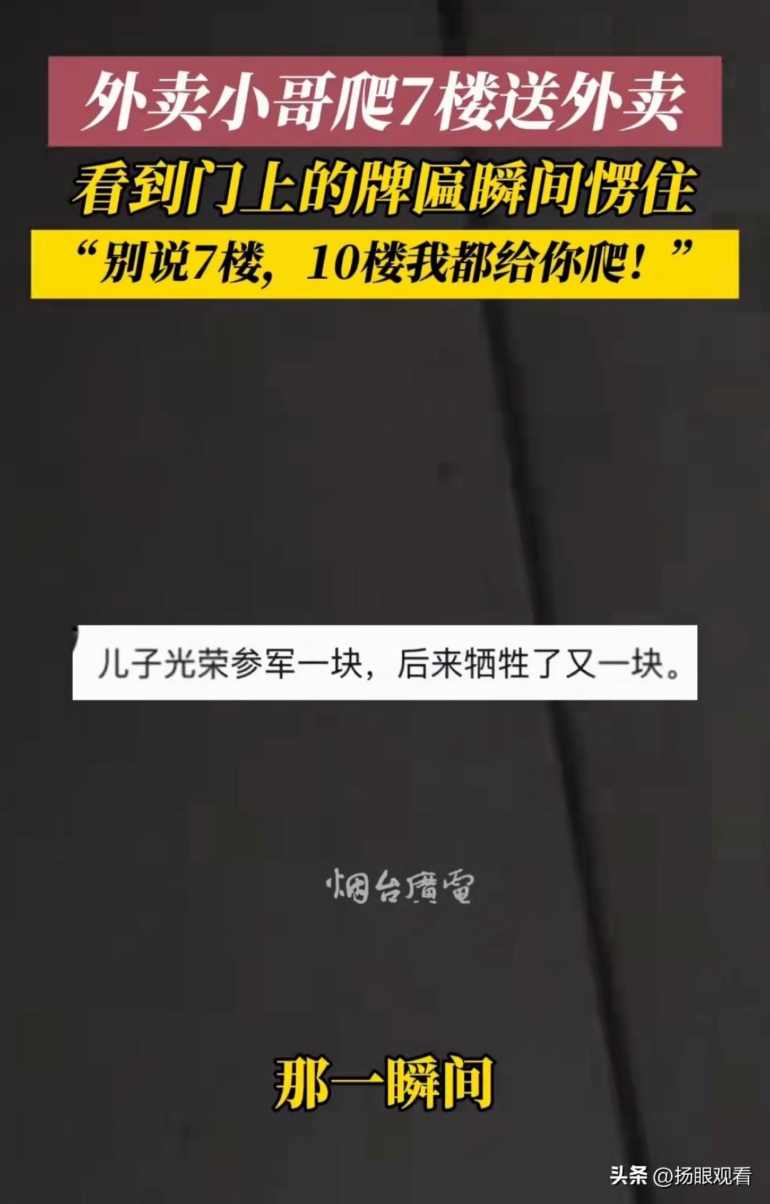 小哥爬7楼送外卖,看到门口牌匾直接愣住😭 真的看哭了!平凡人骨子里的敬意太戳人了❤️ 外卖小哥接到一单7楼的订单 老小区没电梯,爬楼的时候还觉得有点累 好不容易爬到门口,抬头一看牌匾 瞬间就愣住了,所有疲惫都没了 门上挂着光荣之家的牌子 原来这是英雄的家啊! 小哥事后说,当时心里一下子就肃然起敬 别说7楼了,就算是10楼、20楼 也心甘情愿爬上去,这是对英雄最起码的尊重 平凡的岗位,却有着最赤诚的心 小小的举动,藏着大大的温暖 这才是刻在骨子里的家国情怀啊✨