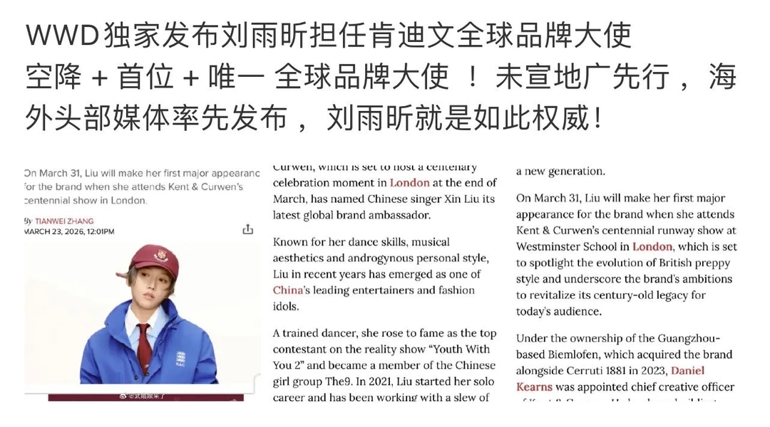 刘雨昕时尚icon的含金量还在上升! 英伦百年奢牌首次打破惯例,空降刘雨昕成为首位全球品牌大使,这排面直接拉满!而且官宣即王炸,WWD Global 全球首发,内外网全平台同步上线,覆盖北京、沈阳、南京、深圳等核心商圈大屏。从正统英伦到东方酷飒,她用清冷贵气完美诠释风格无界的真谛。 舞台上是炸场王者,私下是时尚icon,商业价值与时尚表现力双在线。坐等全球大使闪耀登场百年大秀! #英伦风#时尚表现力#时尚娱你同乐#明星商业价值#刘雨昕#刘雨昕同款#高奢