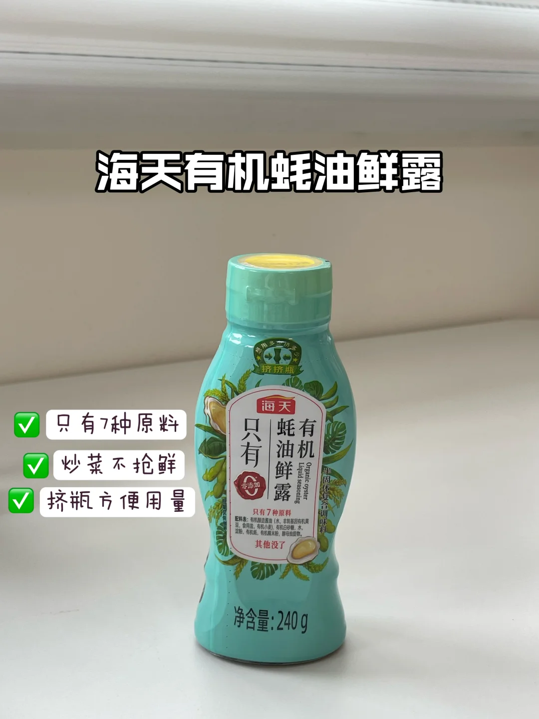 海天有机蚝油鲜露:配料表干净。因为我们做炒菜比较多,所以蚝油就会相对于吃的多一点,但是家中又有👶宝宝,所以我们选择都是这种配料表干净的来吃。它感觉比普通的蚝油味道要淡一点点。