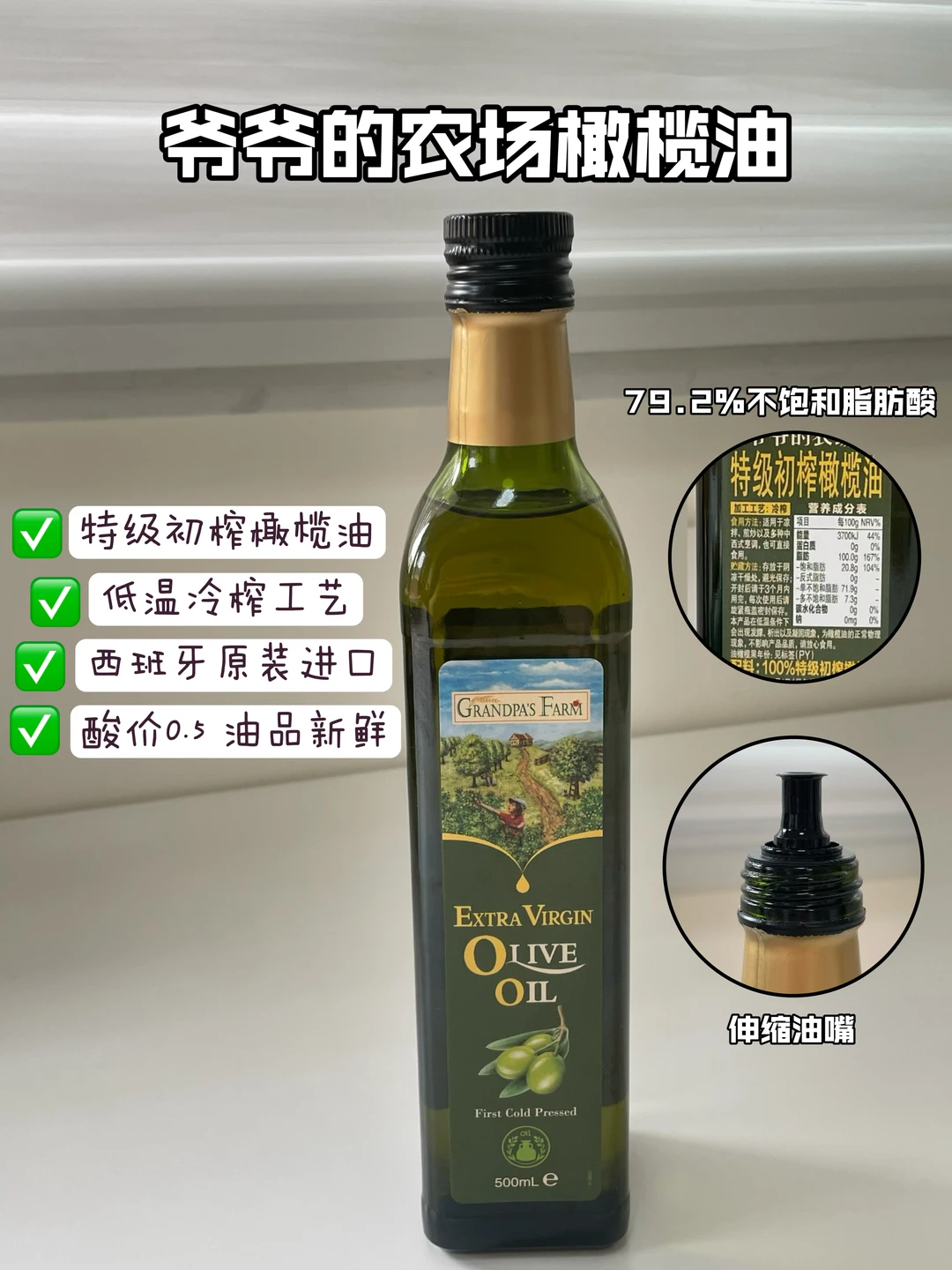 [耶R]爷爷的农场橄榄油:他家是特级初榨橄榄油,西班牙原装进口,低温冷榨工艺,不饱和脂肪酸达到了79.2%,酸价只有0.5,油品真的很新鲜!开盖就能闻到很明显的橄榄果香,炒菜热量比较低,还有就是它伸缩油嘴,好控制油量。食用方法也多种,不管是凉拌、煎炒还是直接使用都可以~