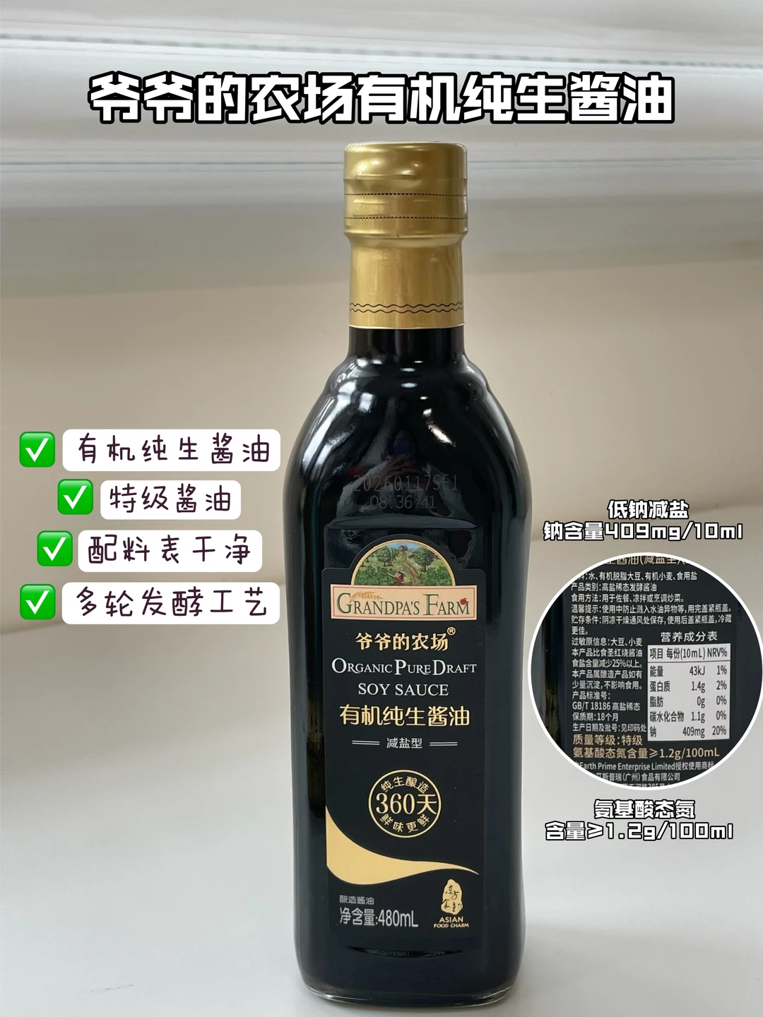 🌹爷爷的农场有机纯生酱油:它是属于特级酱油,氨基酸态氮含量≥1.2g/100ml,很鲜~且它的配料表干净,不添加防腐剂、甜味剂,白砂糖 。低钠减盐,钠含量只有409mg/10ml ,浓郁醇厚,鲜咸适宜,炒菜真的很提味,很健康的一个酱油~