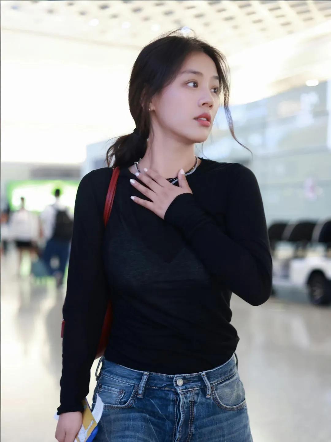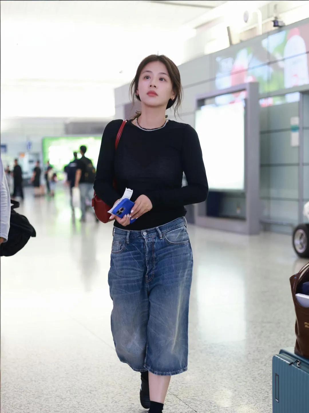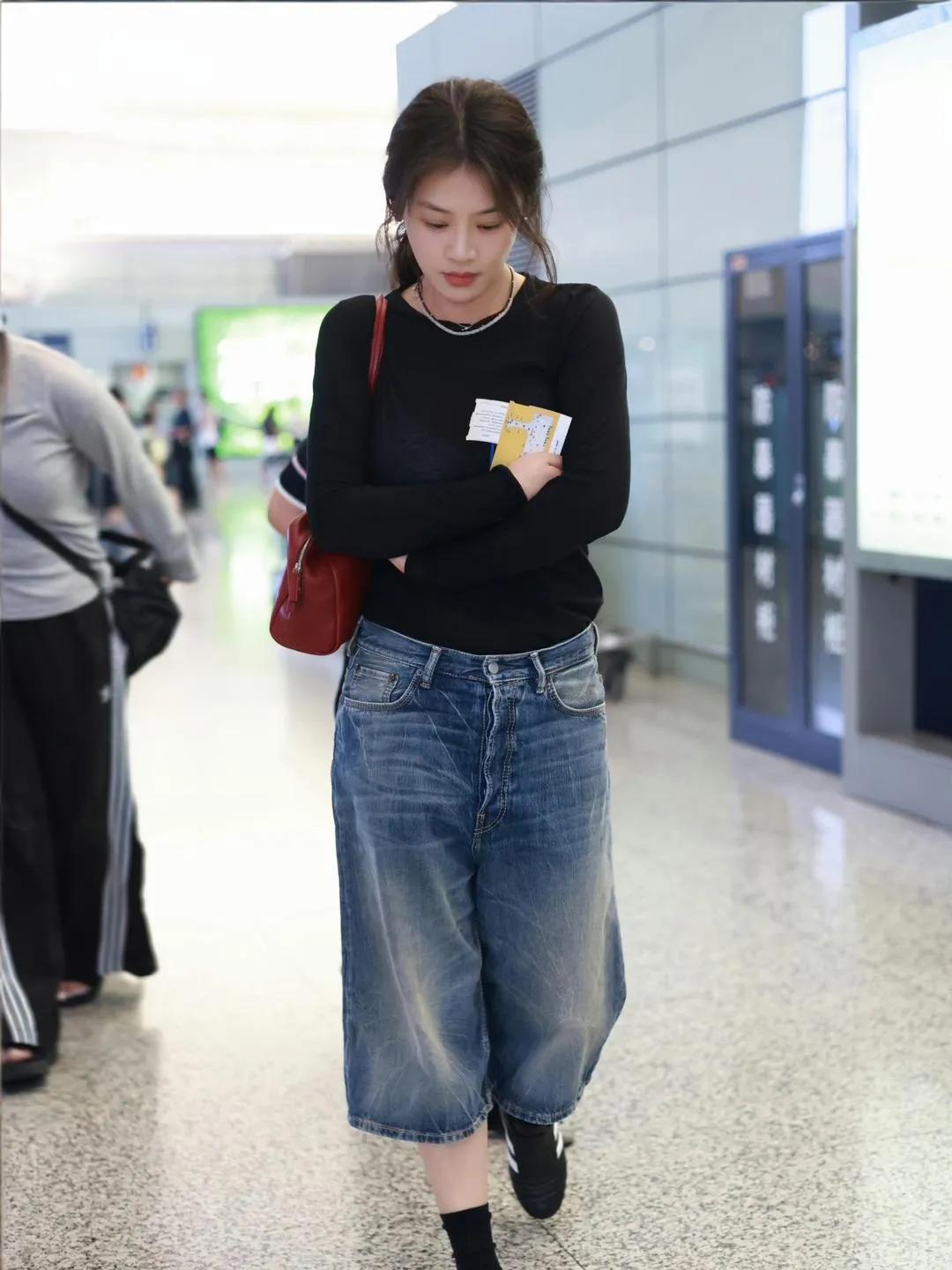 马思纯这一身也太高级了 马思纯机场私服真的绝!黑色修身打底搭配做旧牛仔七分裤,简约又时髦。红色包包作为点缀,松弛感拉满,妥妥的早春穿搭模板!✨ 马思纯 马思纯私服 早春穿搭 机场穿搭