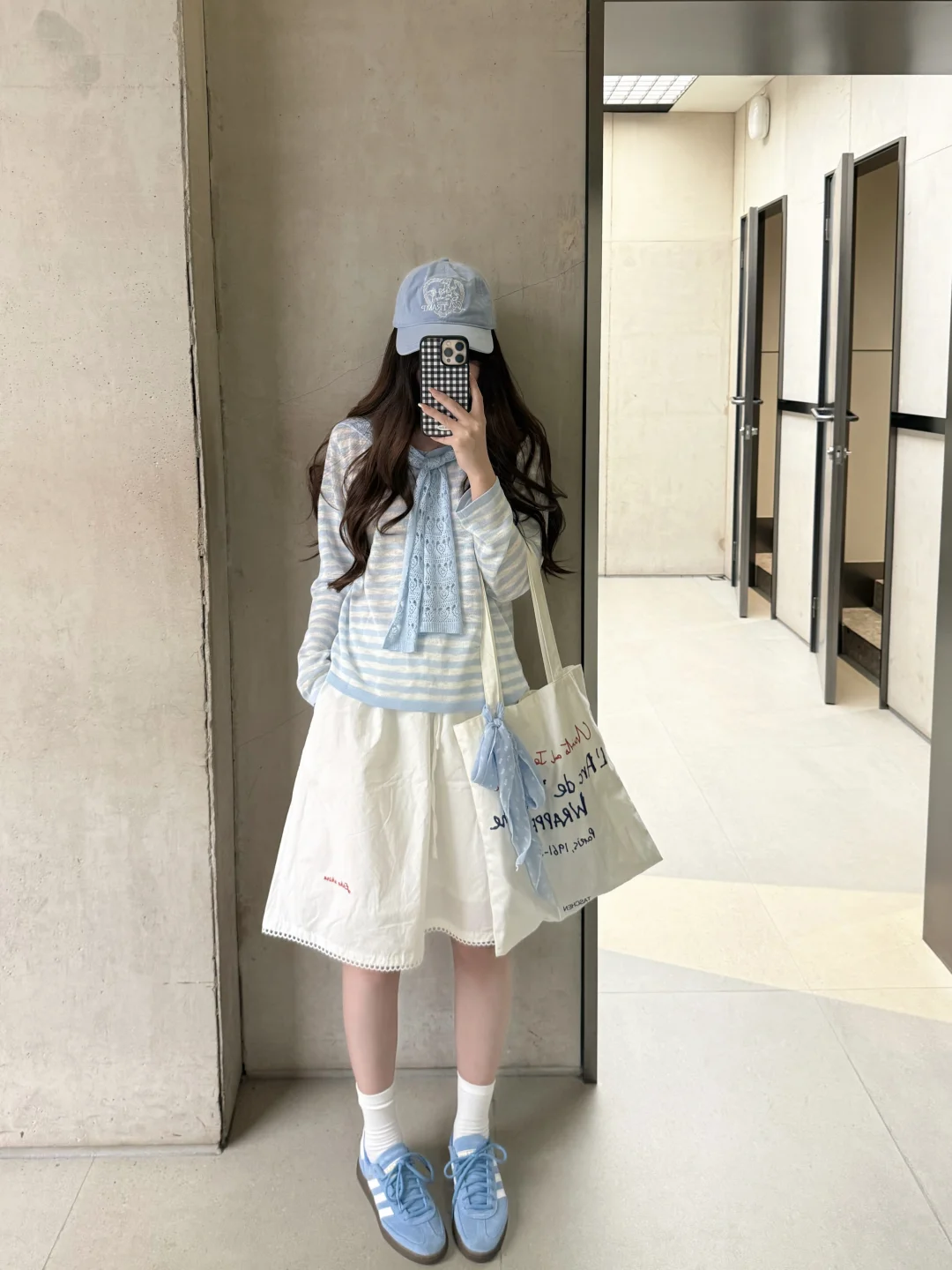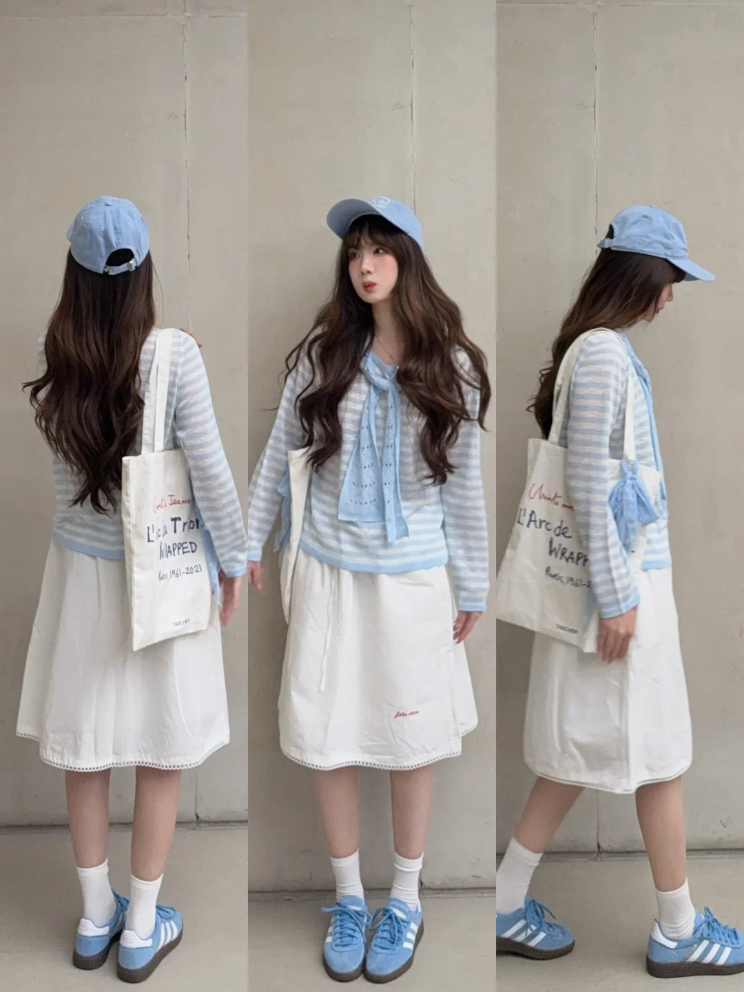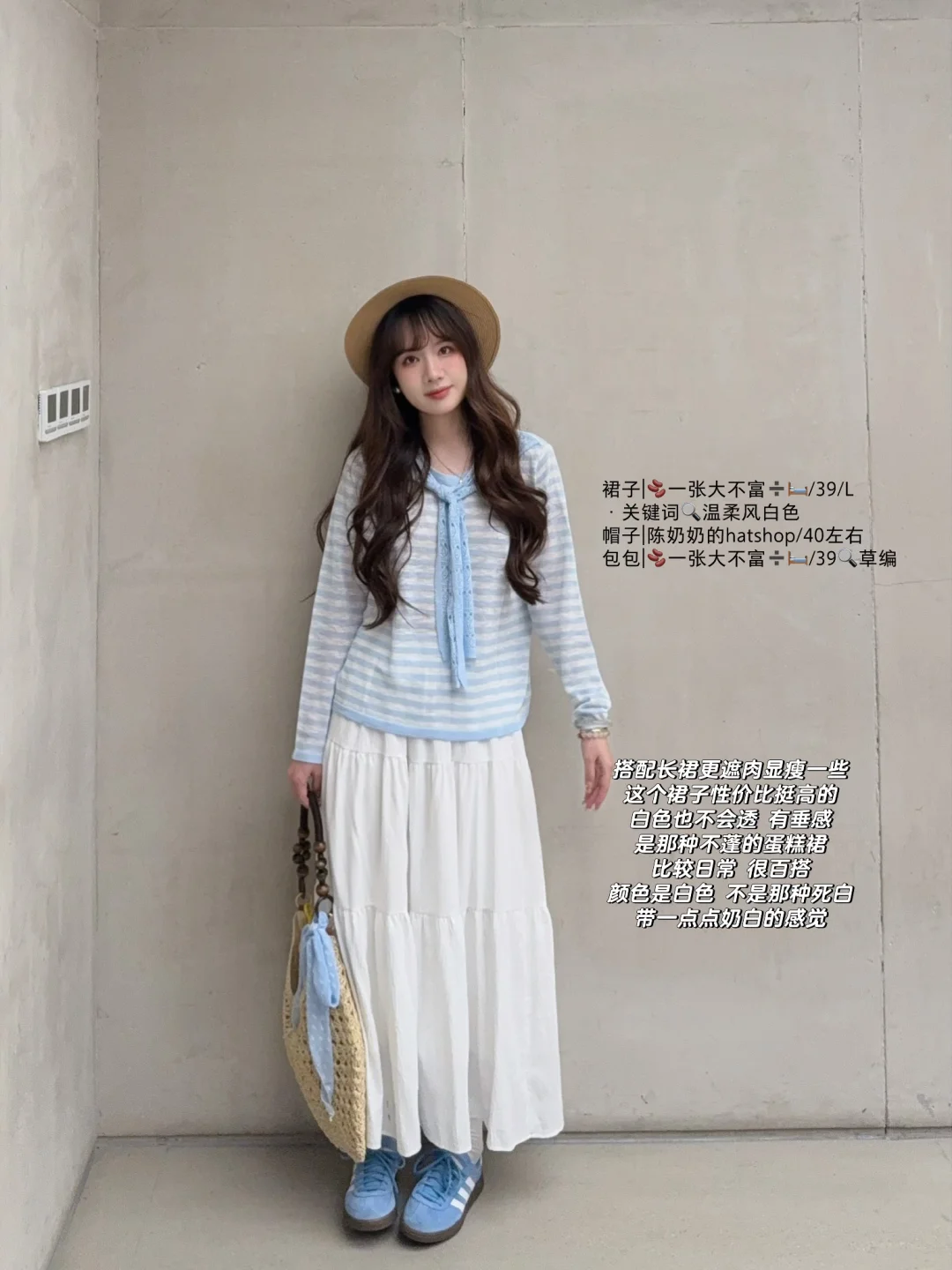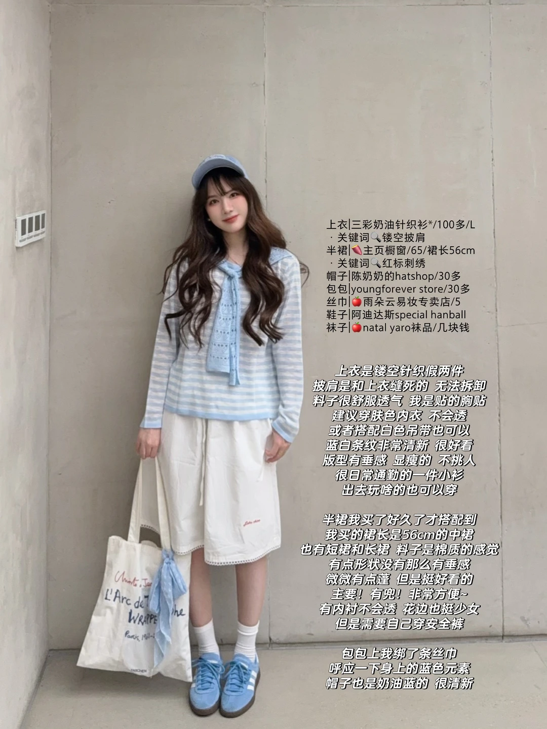 168/105左右 条纹上衣的两套搭配来啦 蓝白色系清新又日常 很干净简约 蓝白配色是很春夏的搭配 适合25度左右的天气~ 罩衫是比较透气的 夏天穿也不会热 喜欢露腿的穿短裙 不喜欢露腿的穿长裙 换成短裤长裤也是可以的哦(白色 牛仔蓝都可以)