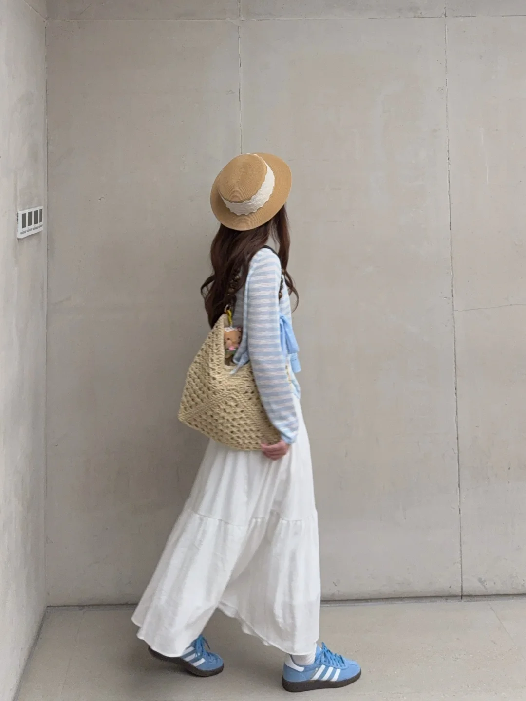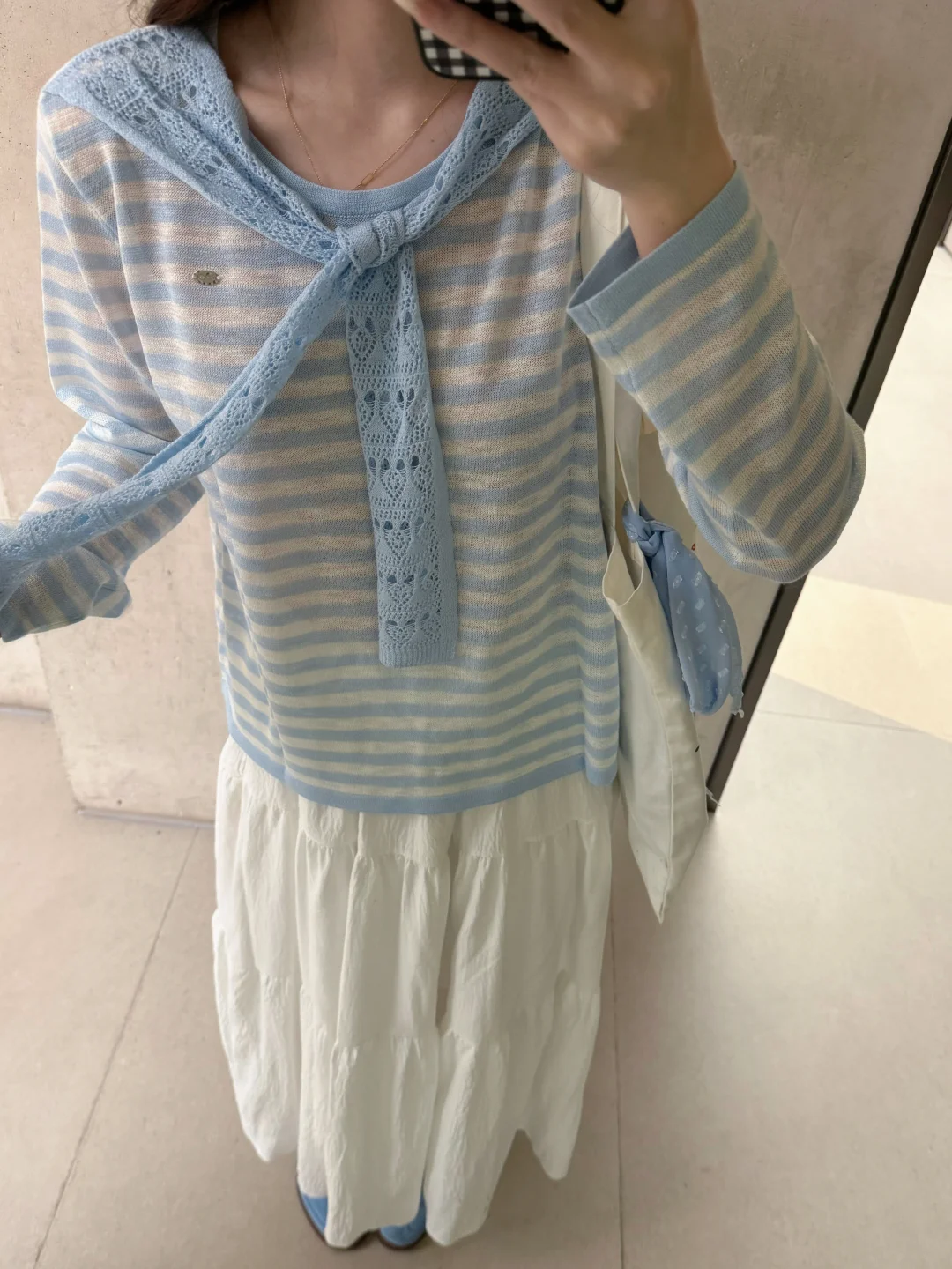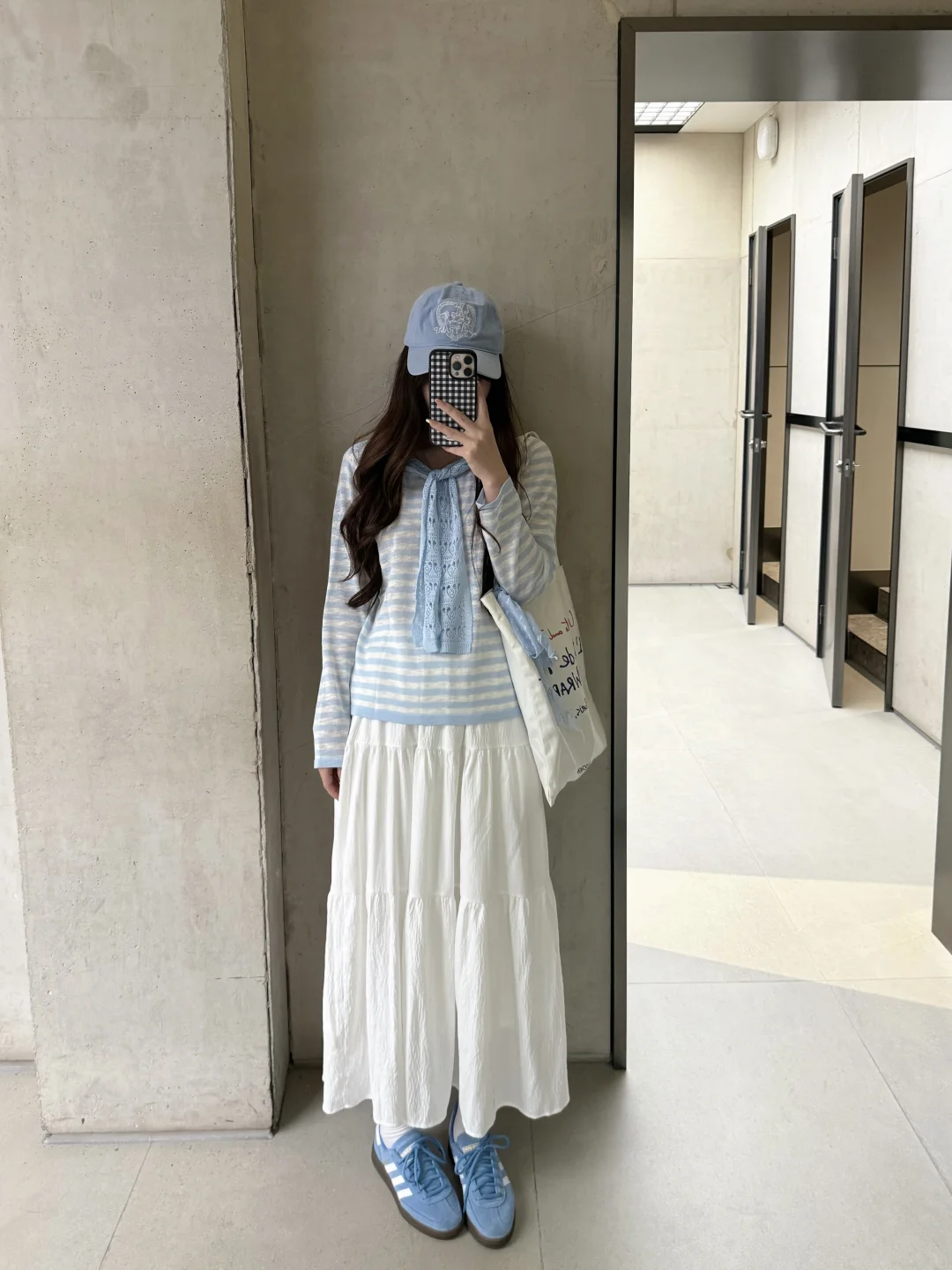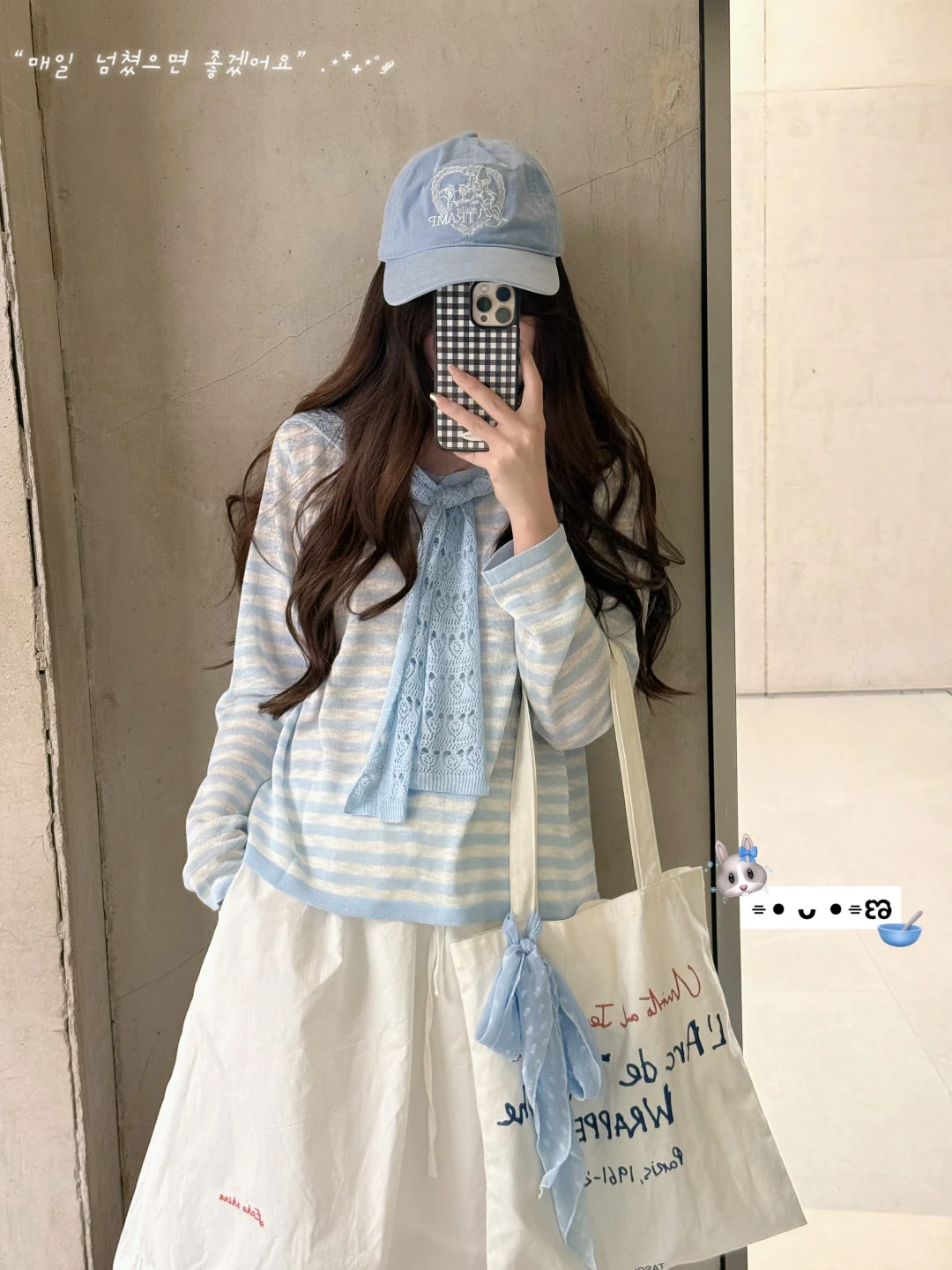 168/105左右 条纹上衣的两套搭配来啦 蓝白色系清新又日常 很干净简约 蓝白配色是很春夏的搭配 适合25度左右的天气~ 罩衫是比较透气的 夏天穿也不会热 喜欢露腿的穿短裙 不喜欢露腿的穿长裙 换成短裤长裤也是可以的哦(白色 牛仔蓝都可以)