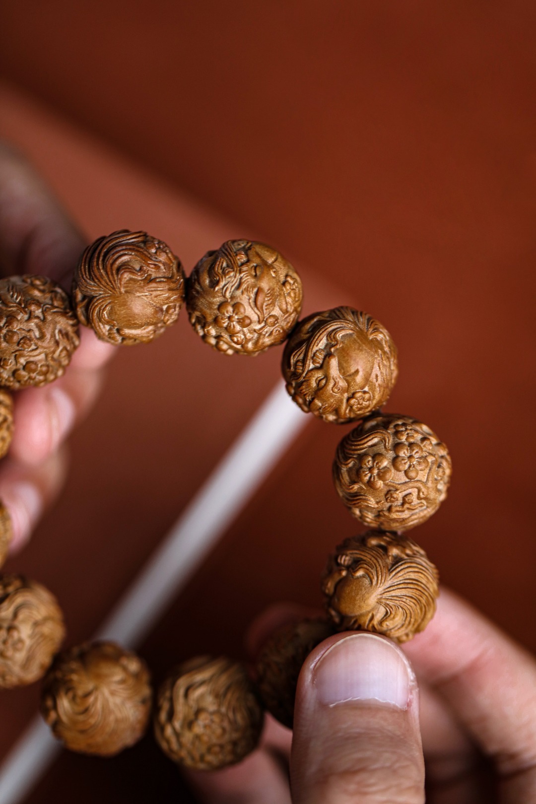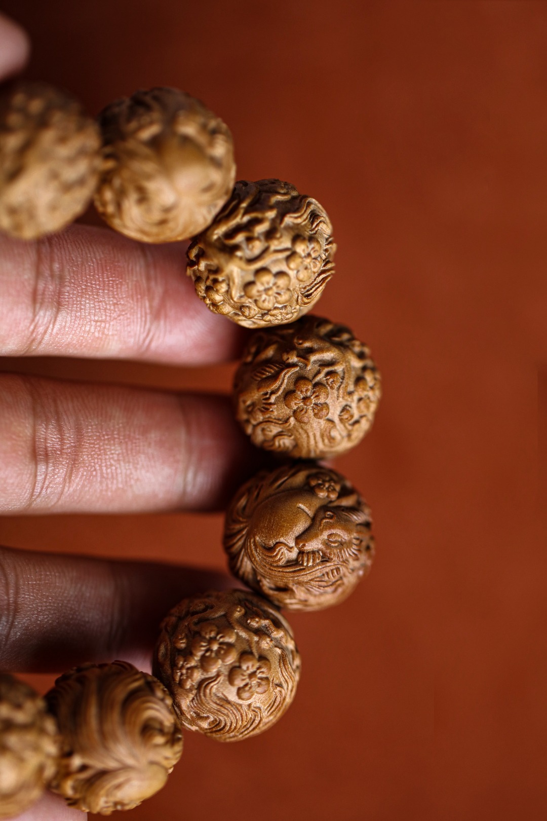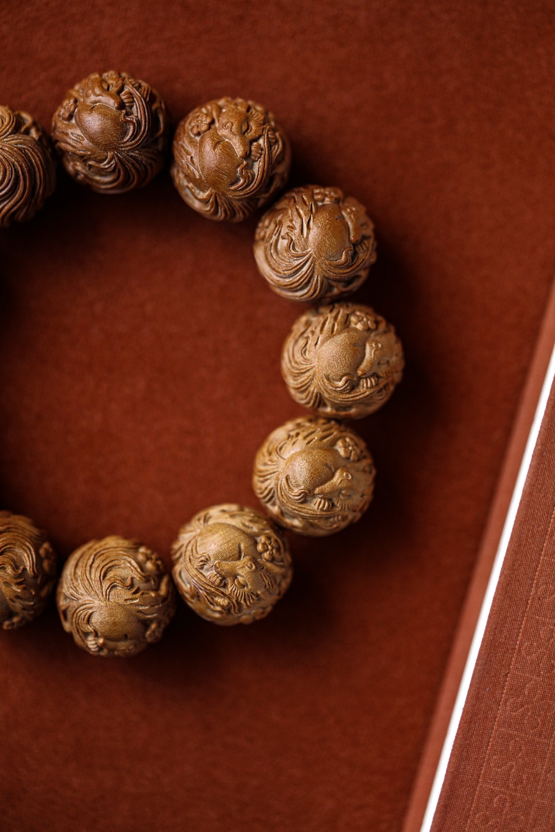 老山檀香【狐狸】20mm12颗手串手工雕琢,形态圆润饱满;狐狸呈抱球态,萌珑精致