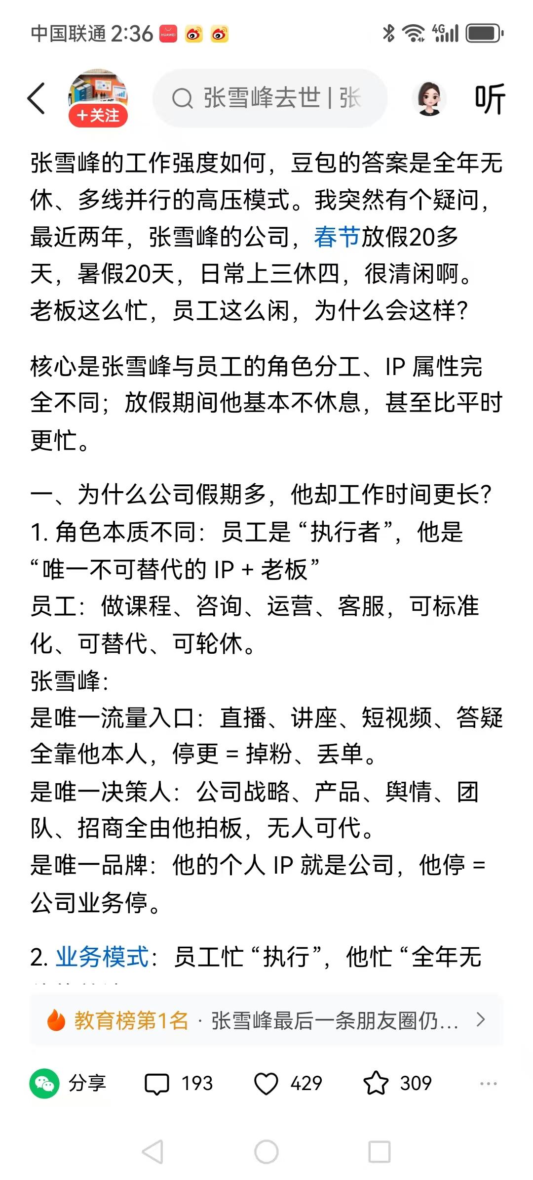 IP型的公司特点,跟那个董宇辉的模式一样,他应该推出更多网红,就像新东方。天下英雄如过江之鲫,人中龙凤尚且举步维艰。 其实就一句话,基因是主责,别的次要。 估计也和新冠后遗症有关,很多中年人猝死都是因为新冠后遗症引起的心脏问题。 看他嘴唇颜色比较深,可能先天心脏就不好吧。东北大老爷们,你拼归拼总得留着小命啊。 一天睡3-4小时,再跑步就是过度劳累。什么时候都是老板忙,只是没有体力活,操心的事太多了。