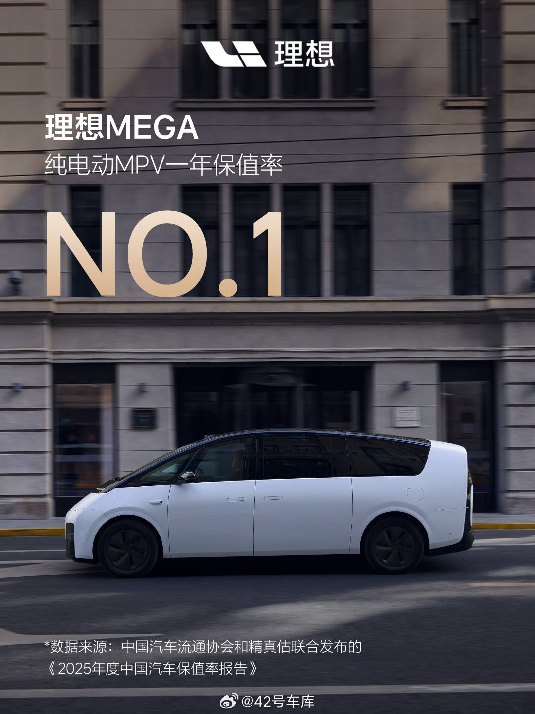 《2025年度中国汽车保值率报告》显示:理想 MEGA 荣获纯电动 MPV 一年