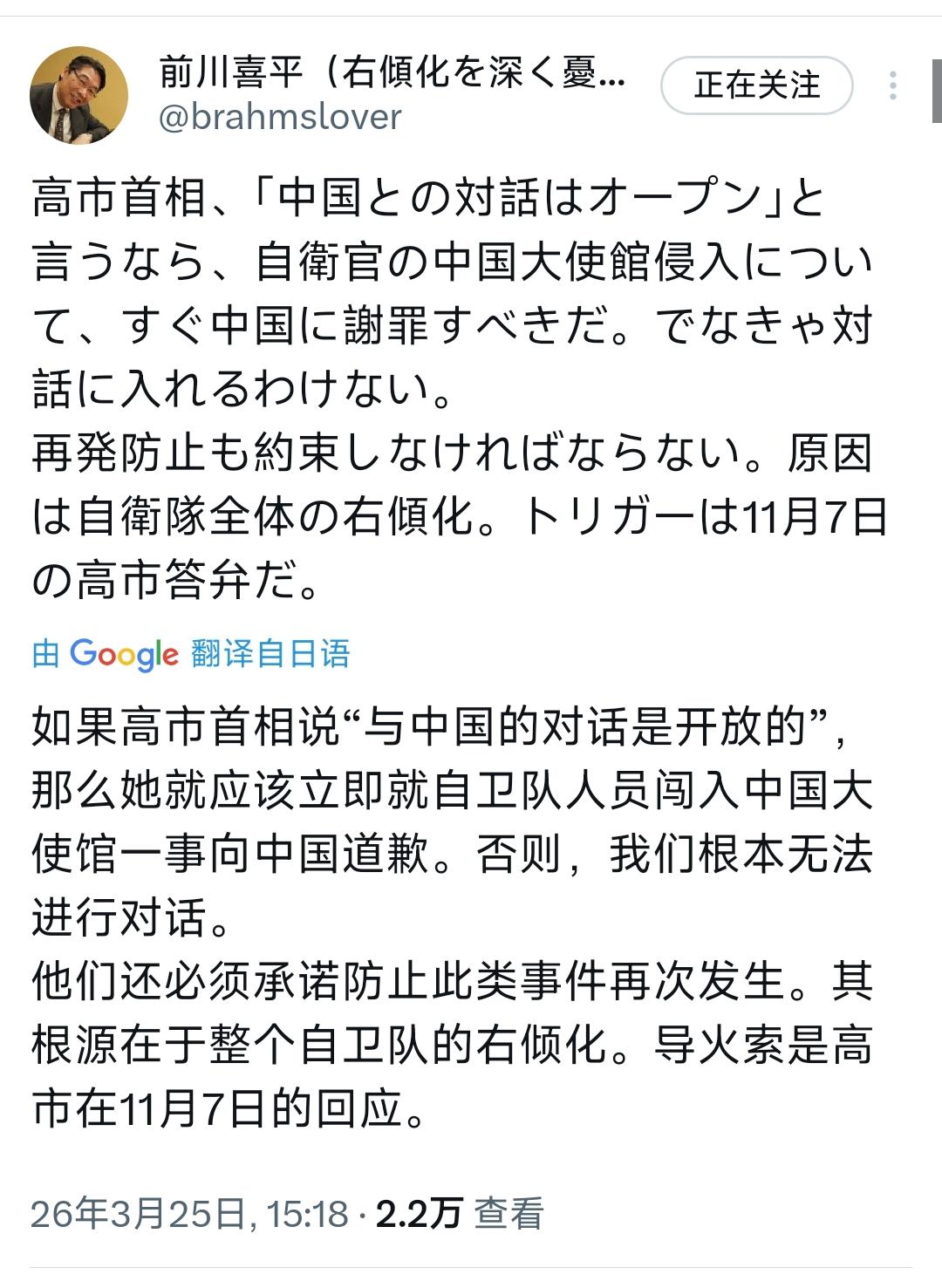 日本前文部科学事务次官前川喜平今天(3月25日)写道:“如果高市首相表示‘与中国对话应保持开放’,那么对于自卫队闯入中国大使馆一事,就必须立即向中国道歉。否则就无法进入对话。同时,还必须承诺防止类似事件再次发生。其根源在于自卫队整体的右倾化,而11月7日高市的回应正是这一问题的导火索。” [机智]评几句:前川喜平戳破了高市早苗在对华关系上的虚伪与矛盾。口口声声说要开放对华对话,却在自卫队闯馆这一违反《维也纳外交关系公约》的恶性事件上避重就轻,无丝毫道歉与反思之意,这样的态度何来对话基础?前川喜平直指事件根源是自卫队整体右倾化,点出高市去年11月7日的涉台错误言论是导火索,更是道破了本质——正是高市早苗内阁一味纵容右翼、刻意制造对华对立,才让极端思潮在自卫队内蔓延,酿成此次闯馆事件。前川喜平的直言,既是对日本政坛理性声音的坚守,更是对高市政府损害中日关系行径的有力驳斥,唯有正视问题、真诚道歉、遏制右倾,中日对话才有真正可能。