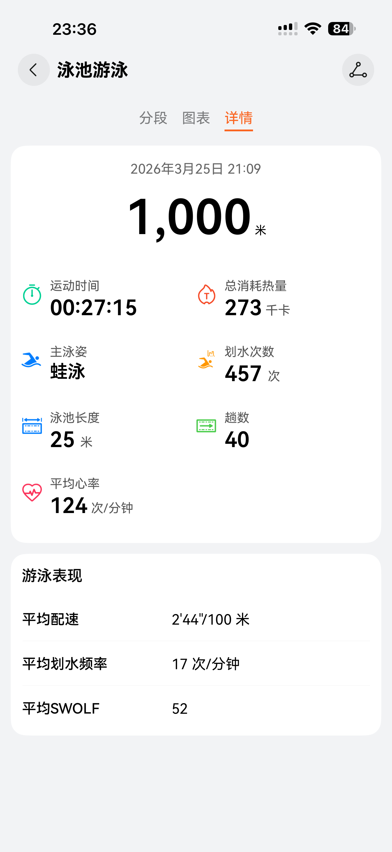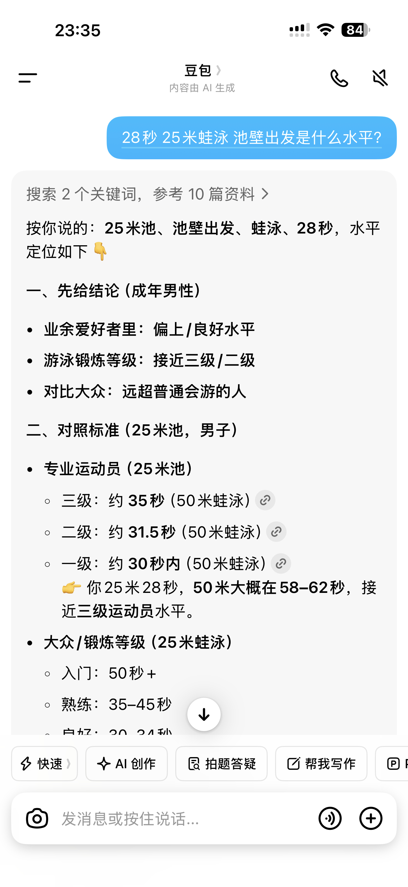 今天蛙泳1000米,最后冲刺28秒,最快一次25米,豆包表扬我达到了业余高手水平
