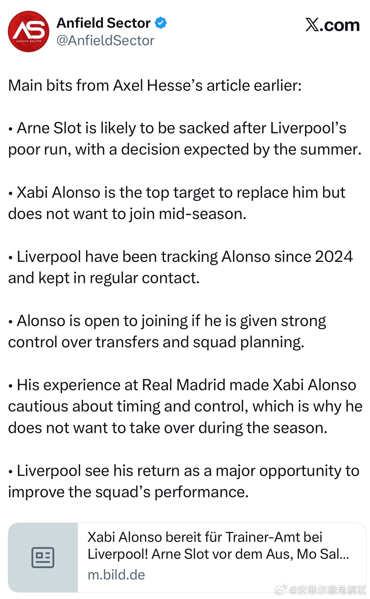 德国图片报的勒沃库森系的记者Axel Hesse(这个人夏窗追维尔茨转会的应该会有印象)发文提到了阿隆索和我军的传闻,以下是文章摘要:1. 球队表现长期没有好转的情况下斯洛特很可能要下课了,这个决定预计会在夏窗做出。2. 阿隆索是接替斯洛特的头号目标,但是阿隆索不想在赛季中期接手。3. 自2024年起利物浦就在关注阿隆索的情况,并且一直和他保持着联系。4. 如果阿隆索能在转会决策以及球队阵容规划里有足够的掌控权那他会对加盟利物浦持开放态度。5. 阿隆索在皇马的经历也让他意识到时间和掌控权的重要性,这也是为什么他不想赛季中期接手的原因。6. 利物浦也把他的回归当作是一个提升球队表现的重大机会。