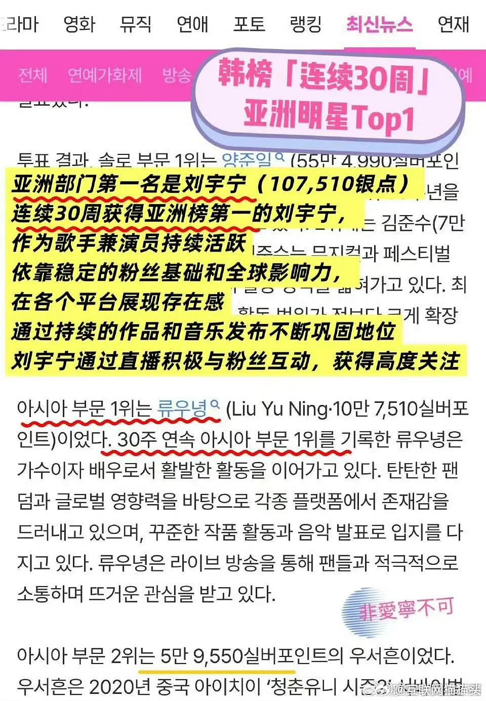 刘宇宁在韩国连续30周荣获第一