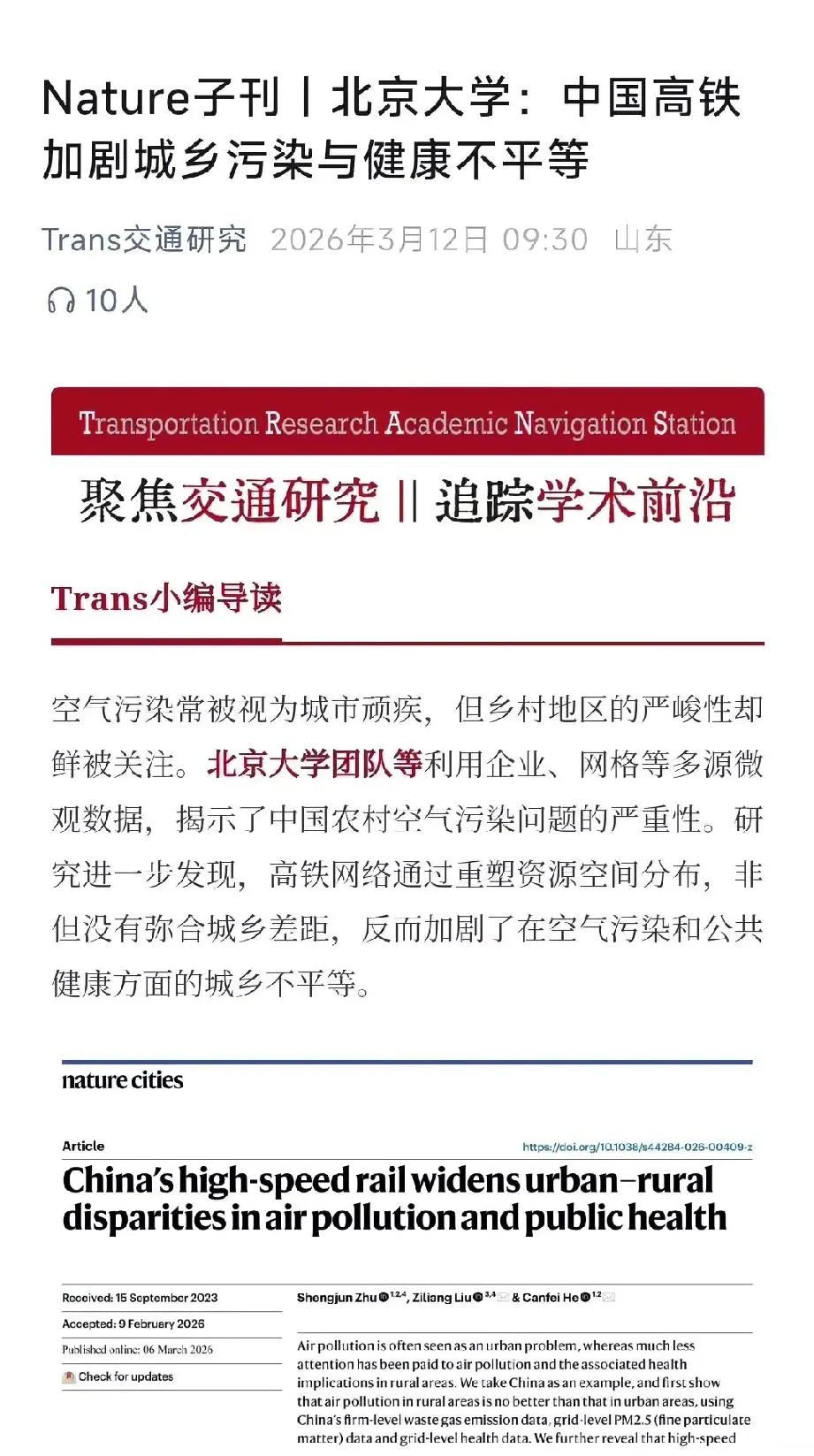 图一北大原副校长任羽中因为被逮捕并提起公诉,直接就上热搜了 图二里北大新研究就说“高铁加剧城乡污染与健康不平等”。怎么都是北大呢?也太魔幻了吧。 教育反腐,很正常,结果学术研究又来掺和一脚。高铁明明是咱们国家拿得出手的成就,怎么就成了替罪羊了呢? 想想还真挺讽刺的,一边是反腐的严厉措施,一边是有争议的论文。象牙塔里的这些事啊,总比电视剧里演的还精彩。