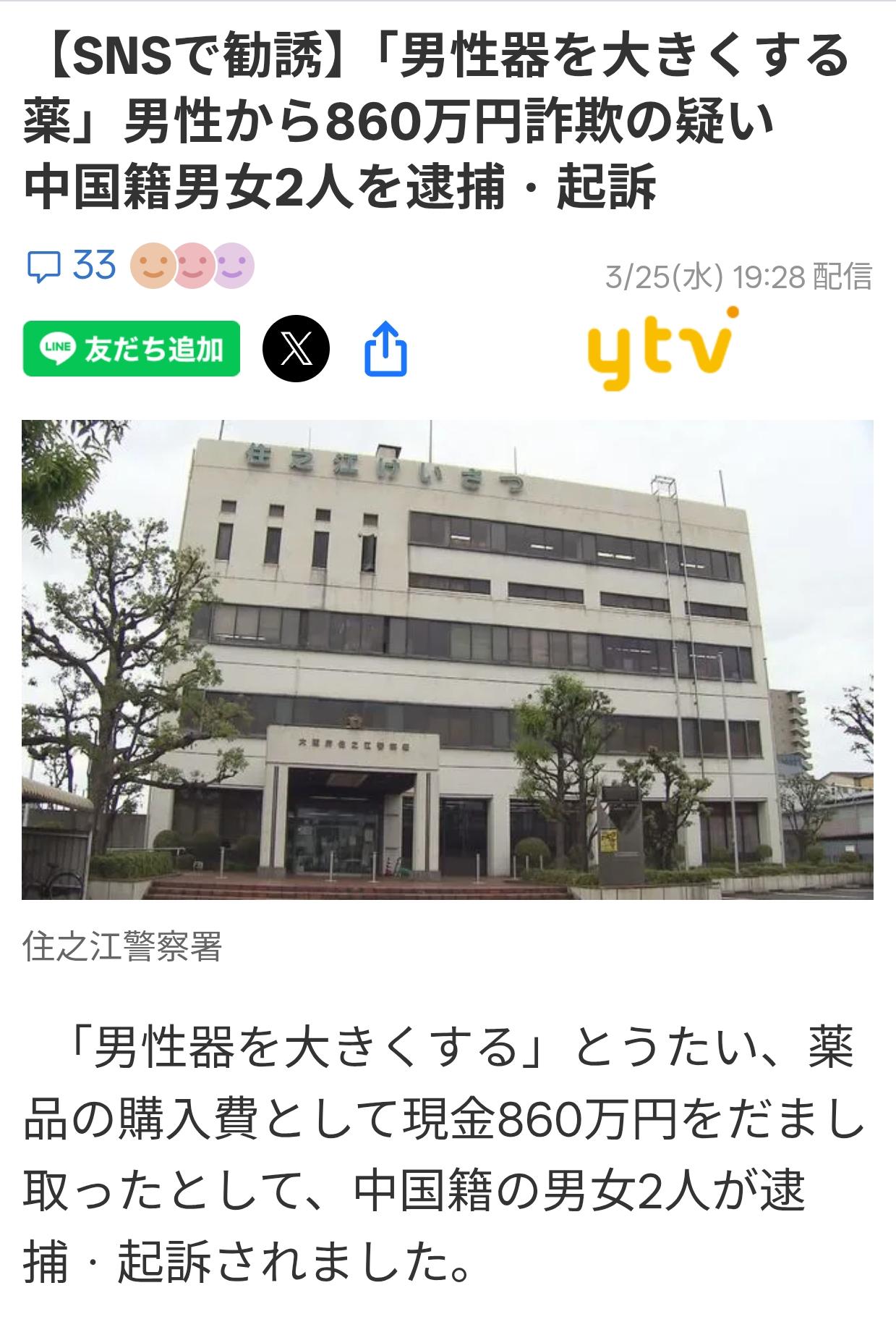 假药骗得千万日元男女被法办 日媒《YTV NEWS 》3月25日报道:两名中国籍男女以购买“增大男性生殖器的药物”为幌子,诈骗现金860万日元(约合人民币37万元)被逮捕并起诉。 被控诈骗的是杨丰磐(44岁),居住在大阪市浪速区,以及被告姜曼(28岁),居住在东京杉并区的公司职员。 警方称,杨丰磐等人被控于2025年以购买具有男性生殖器增大效果的药物为名,诈骗一名居住在群马县的70多岁男子现金860万日元。 杨丰磐和他人一起假扮医生,通过社交媒体告知受骗男子:“我卖的药保证有效。 如果治疗不成功,将全额退款。“ 被告姜曼负责从受骗男子那里收取现金,并给了他几颗声称”能让男性生殖器变大“的药膏。 被告人交代称:用类似手法诈骗了四名男子的钱财,总金额达到1.195亿日元约合52万人民币。 针对警方调查,杨等人否认指控,称“当时并未意识到这是违法行为。” 警方认为还有其他人参与了案件,正在调查中。 我要上精选-全民写作大赛