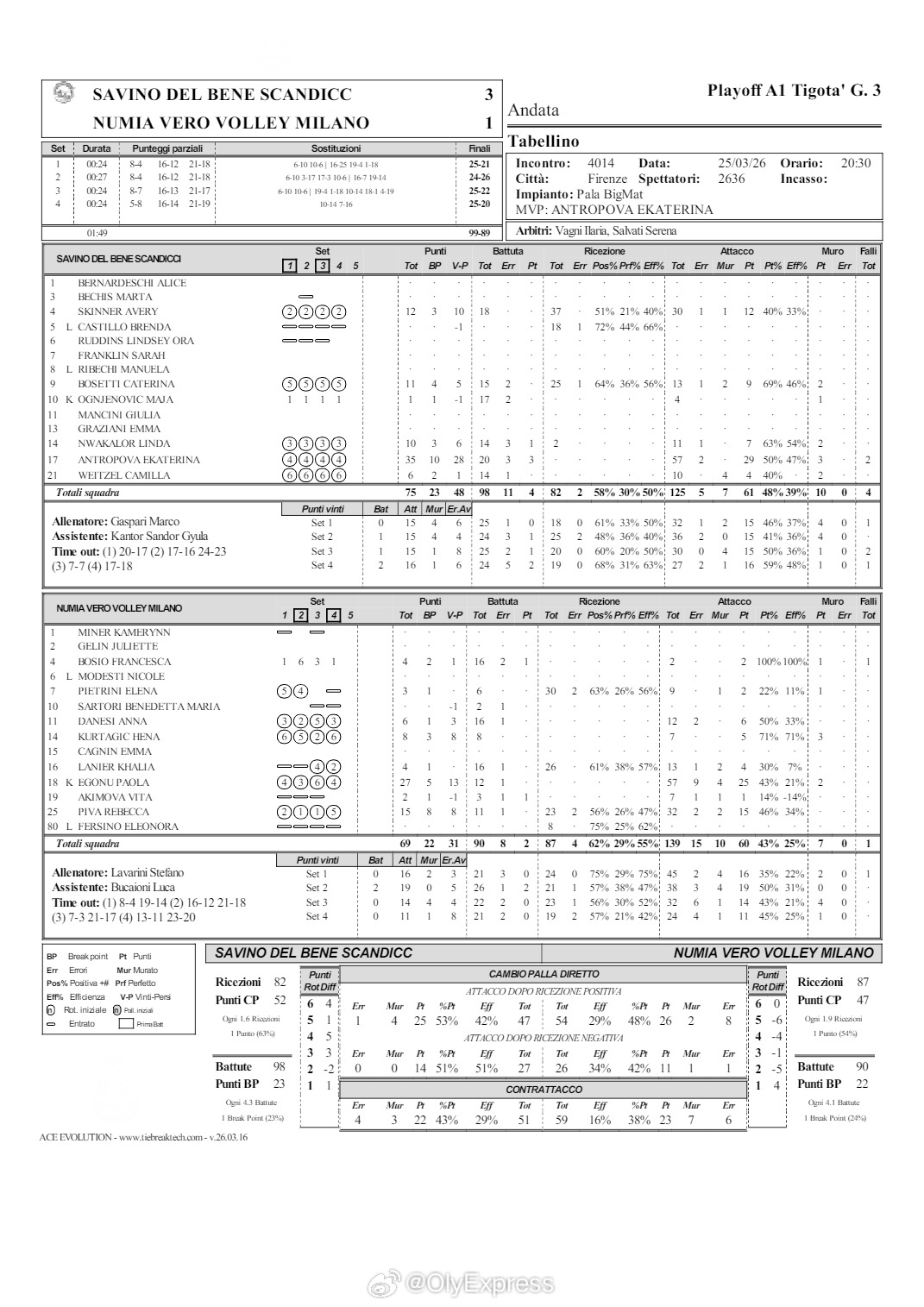 【意甲女排半决赛III斯坎迪奇3-1米兰 安娃35分MVP】国际排坛战报速递 3月25日佛罗伦萨,意甲女排半决赛第三回合,斯坎迪奇主场3-1(25-21/24-26/25-22/25-20)击败米兰,将总比分扳成1-2。安特罗波娃35分(57扣29中3发3拦)荣膺MVP、斯金纳12分、波塞蒂11分、恩瓦卡勒10分,埃格努27分、皮瓦15分。第四回合将于3月30日3:30移师米兰进行。
