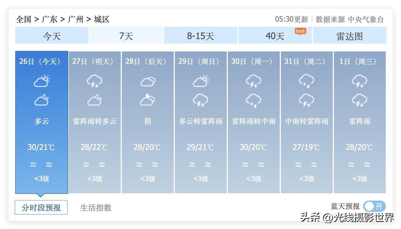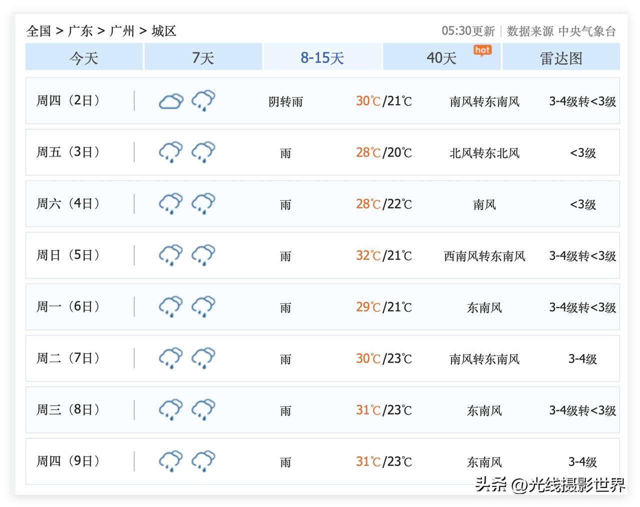 噢!广东省广州市,即将迎来烦闷的闷热天气!3月27日到4月9日,广州市,下雨天很多很多,最高气温冲刺32度……3月30日,星期一,广州雷阵雨转中雨,最高气温30度……大家觉得这会是什么样的具体感受呢?! 中央气象台的最新天气预报显示,中长期天气预报大趋势,4月2日到9日,广州可能每天都会下点雨,最高气温持续维持在30-32度……闷热,烦躁,潮湿……哎…… 接下来的广州,适合种蘑菇……不太适合旅行……广州最好的旅游季节,国庆节结束之后,一直到清明节之前……从清明节到国庆节,这段时间,广州不是最佳旅游季节哦!